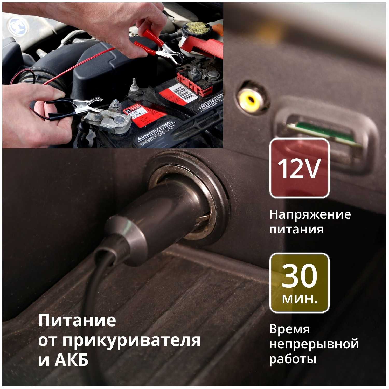 Манометр и кнопка включения на шланге позволяют контролировать процесс у колеса, не возвращаясь к компрессору. Однако при подключении к АКБ требуется открывать капот — это единственное неудобство для пользователей, привыкших к питанию от прикуривателя. -