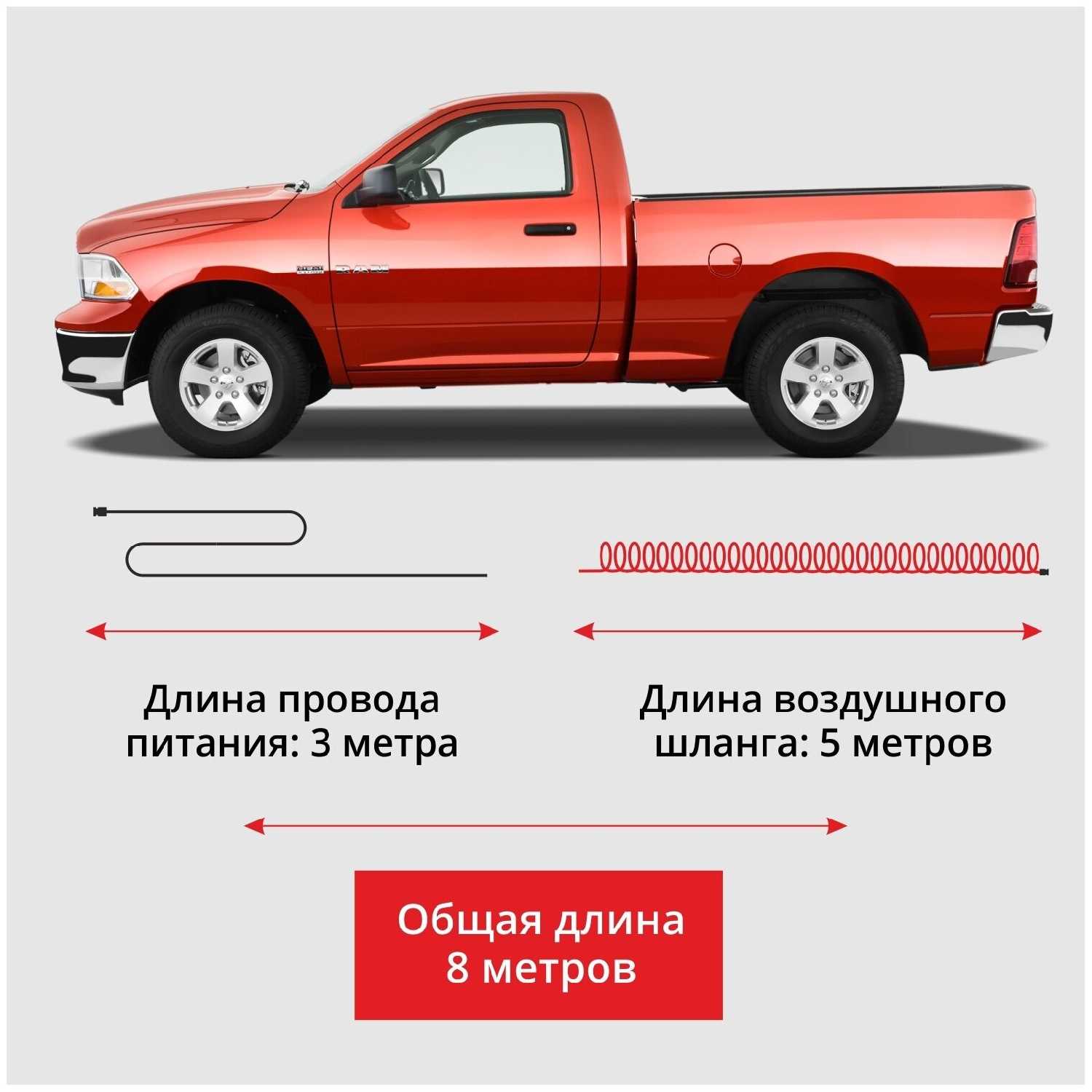 Витой пружинный шланг — ключевое преимущество: он легко растягивается до 3 метров, позволяя подкачать все 4 колеса без перестановки компрессора. Пользователи подчеркивают, что это исключает волочение устройства по земле. Дополнительно длинный провод питания (от АКБ или прикуривателя) обеспечивает гибкость размещения у любого колеса. -