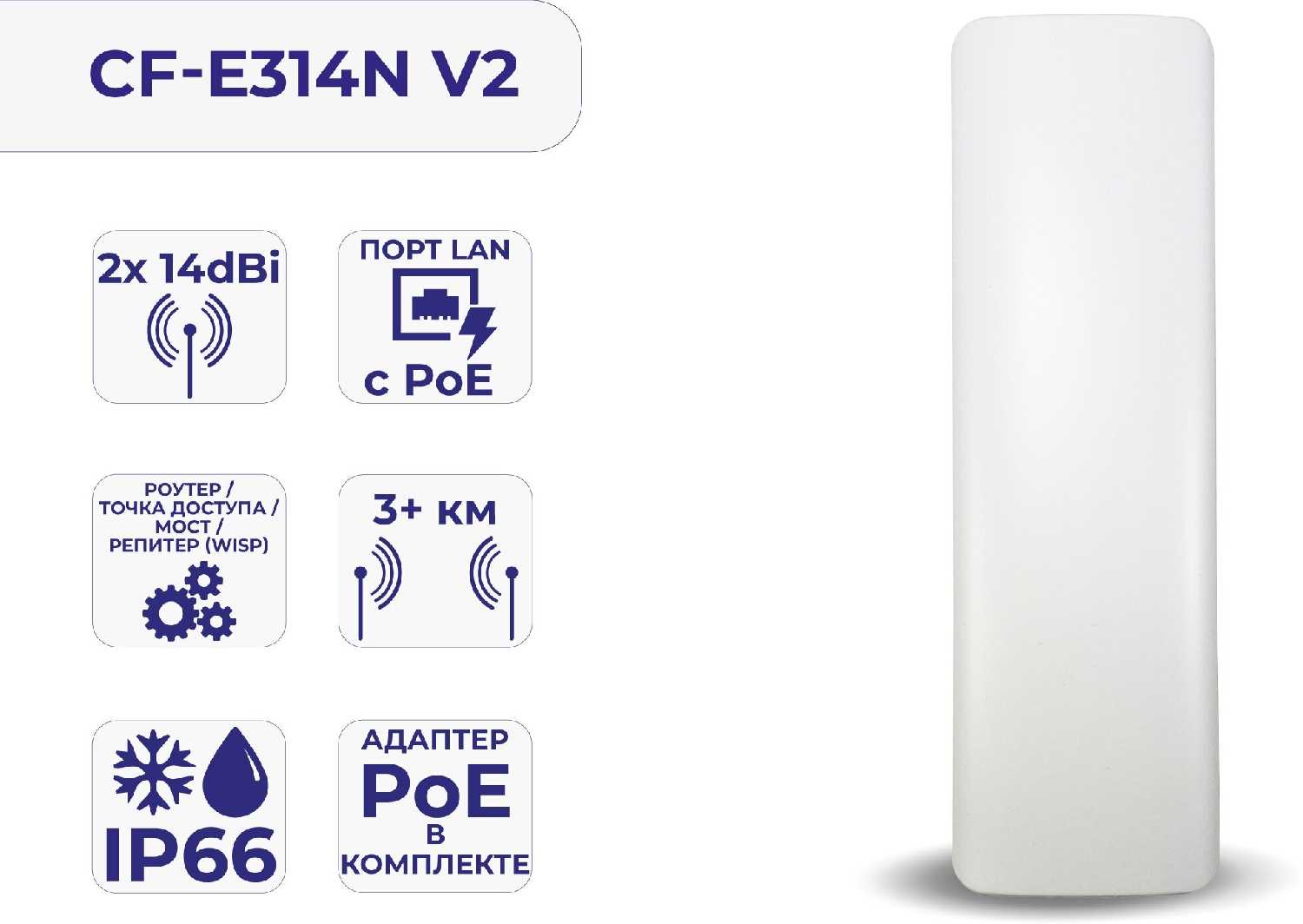 | Дополнительная информация : | COMFAST CF-E314N V2 CPE, PoE-инжектор, крепеж, кабель, гарантийный талон, инструкция |
