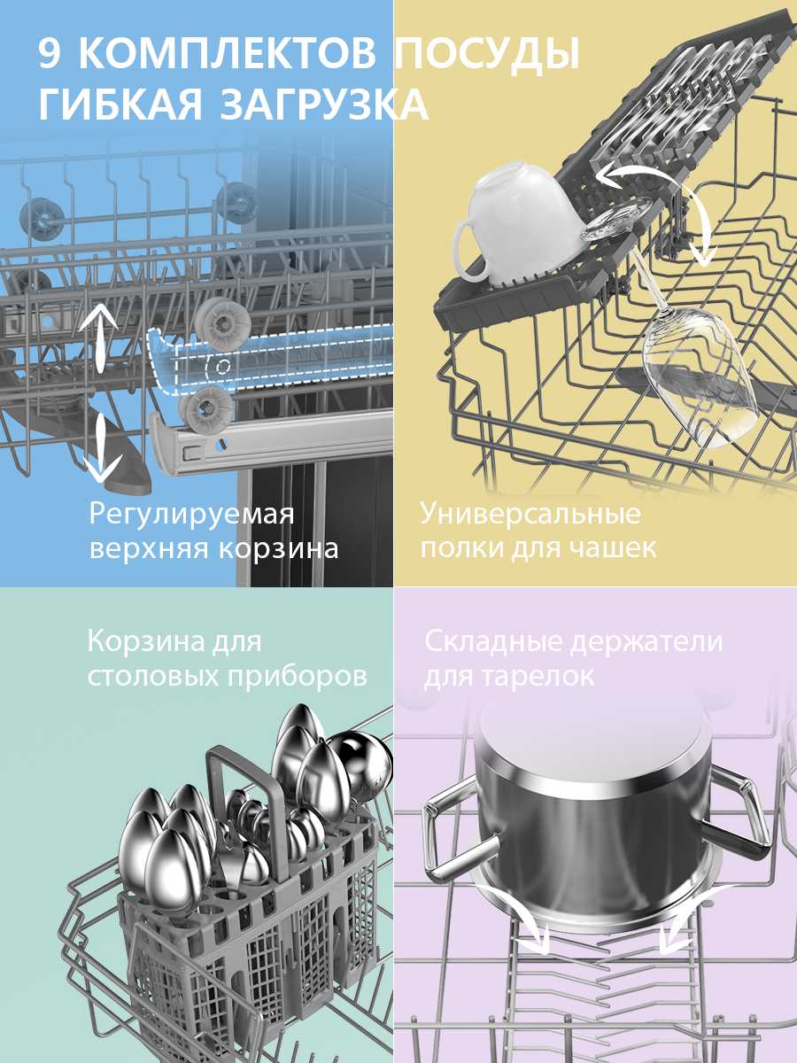 | Особенности : | автоматическое открывание дверцы по завершении цикла, использование средств 3 в 1, регулируемая по высоте корзина для посуды, таймер отсрочки |