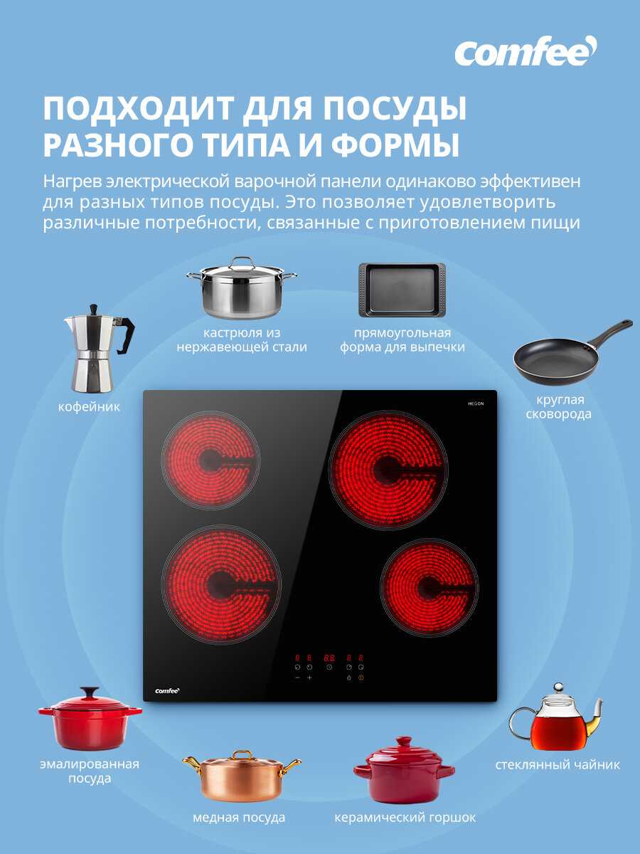 Панель совместима с любой посудой, имеющей плоское дно, однако эмалированные кастрюли оставляют царапины и пятна уже после 2–3 использований. Нагревательные элементы не повреждают керамику или сталь, но для сохранения внешнего вида поверхности рекомендуется избегать алюминиевой и деформированной утвари. -