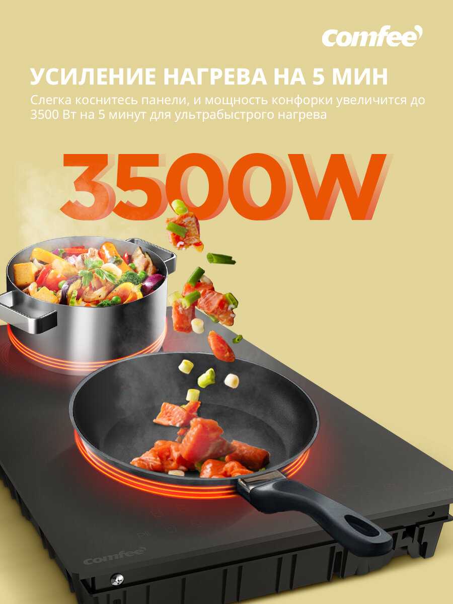 Пользователи единогласно отмечают исключительную скорость нагрева: литр воды закипает менее чем за минуту на максимальной мощности (режим 9). Приготовление пищи занимает вдвое меньше времени по сравнению с газовыми и обычными электрическими плитами. Эффективность обеспечивается технологией непрерывного нагрева на всех режимах, включая низкие мощности, что предотвращает прерывистое кипение. -