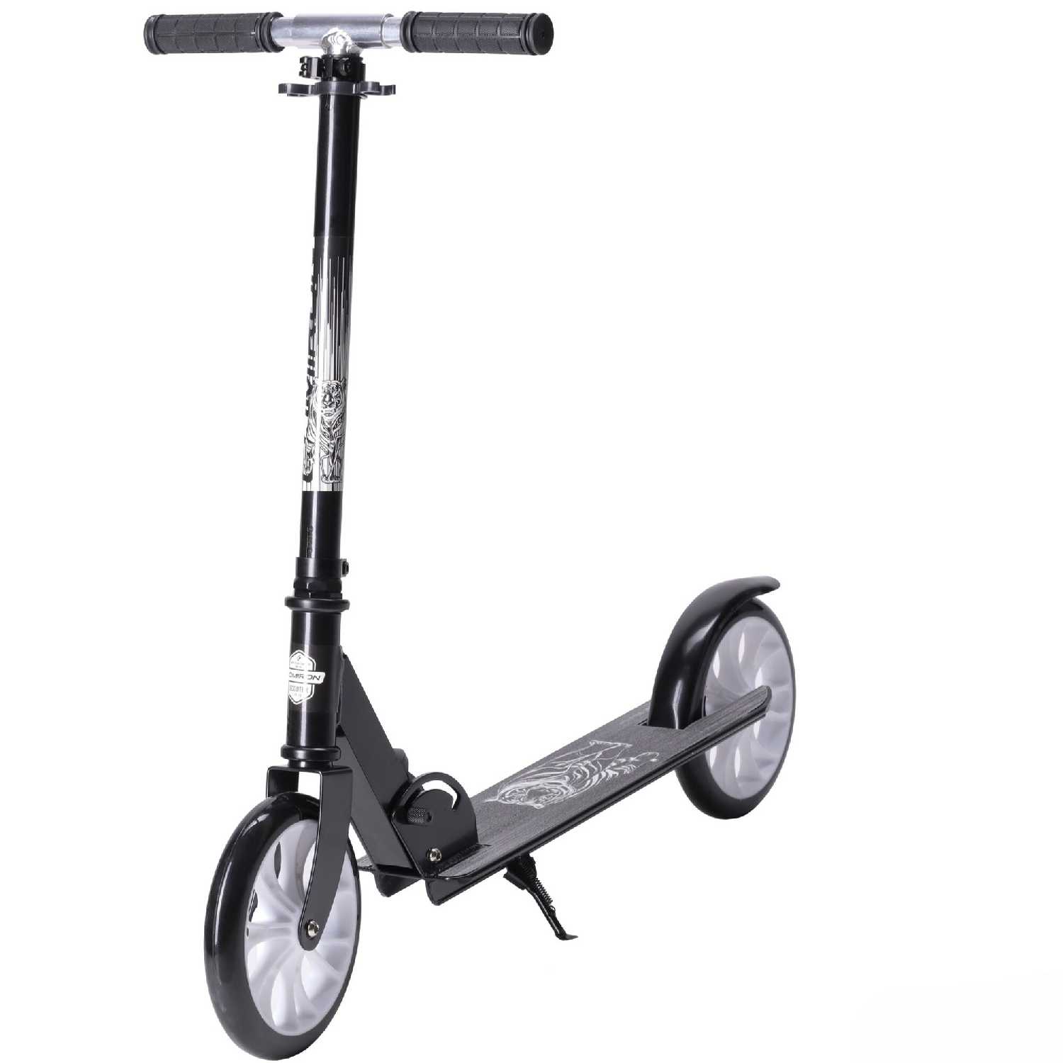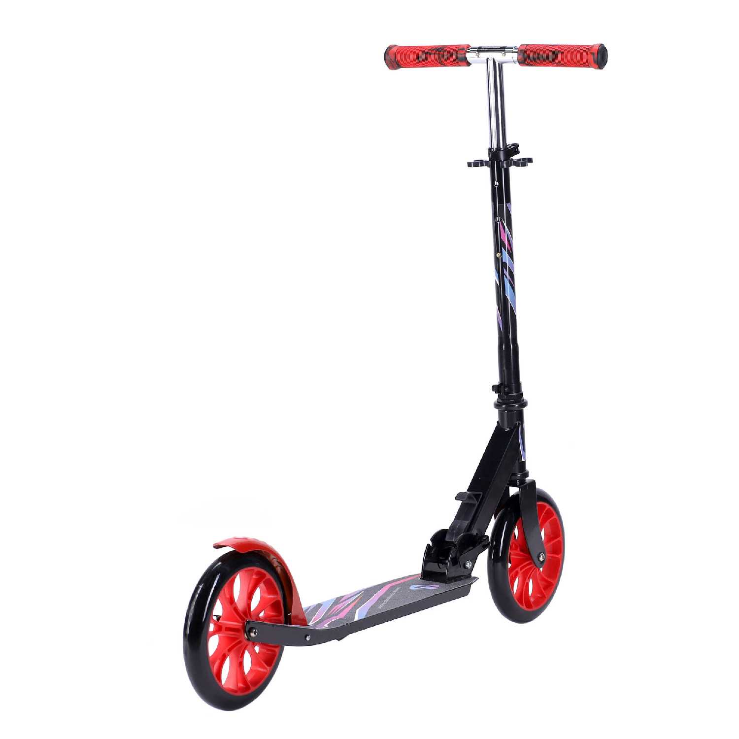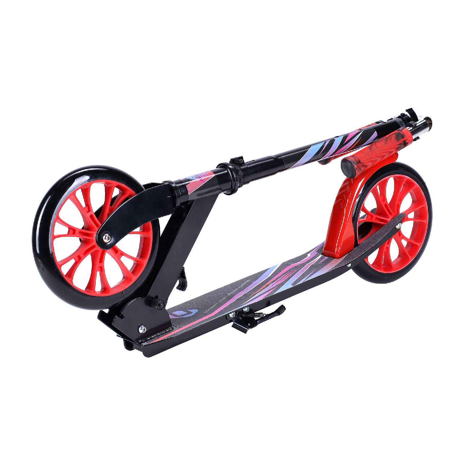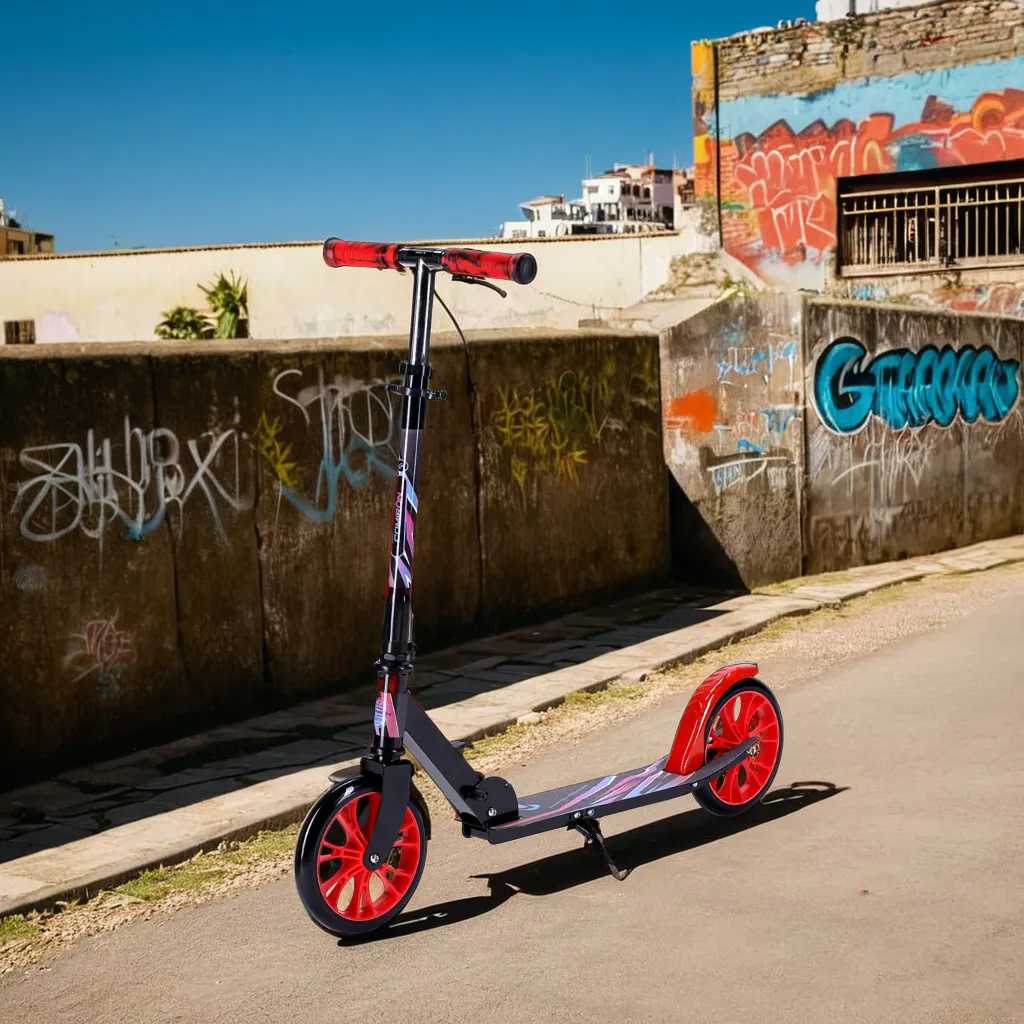 Эксплуатационные характеристики и управление: Эксплуатационные качества самоката формируют его образ как скоростного, но требующего осторожности средства передвижения для детей. Большие колёса в сочетании с хорошими подшипниками, по единодушному мнению пользователей, обеспечивают высокий накат и существенную скорость, превосходящую ожидания для данной категории товаров. Эта особенность делает самокат привлекательным для поездок в школу, так как позволяет ребёнку экономить время и не опаздывать, но одновременно диктует обязательное использование защитной экипировки на начальном этапе. Тормозная система, реализованная в виде крыльного тормоза, подвергается критике за низкую эффективность — пользователи характеризуют её действие как простое скольжение по поверхности колеса без создания достаточного усилия для быстрой остановки. Управляемость самоката осложнена тугым ходом руля, который, по некоторым данным, не был смазан на заводе, а также возможным отклонением рулевой стойки от оси, что создаёт дисбаланс при движении. Для ребёнка весом 50 кг самокат оказывается вполне приемлемым по динамическим характеристикам, подтверждая свою функциональность для ежедневных городских поездок. Лёгкость конструкции, отмеченная многими, является палкой о двух концах: с одной стороны, она позволяет детям самостоятельно складывать и переносить его, а с другой — косвенно указывает на общую облегчённость и, возможно, хлипкость конструкции. Отсутствие штатной блокировки руля в сложенном состоянии создаёт неудобства при переноске, так как дека свободно болтается и может задеть окружающих, например, в общественном транспорте. Подножка, присутствующая в конструкции, добавляет удобства для кратковременных остановок, но не компенсирует недостатков в базовых системах управления и безопасности.