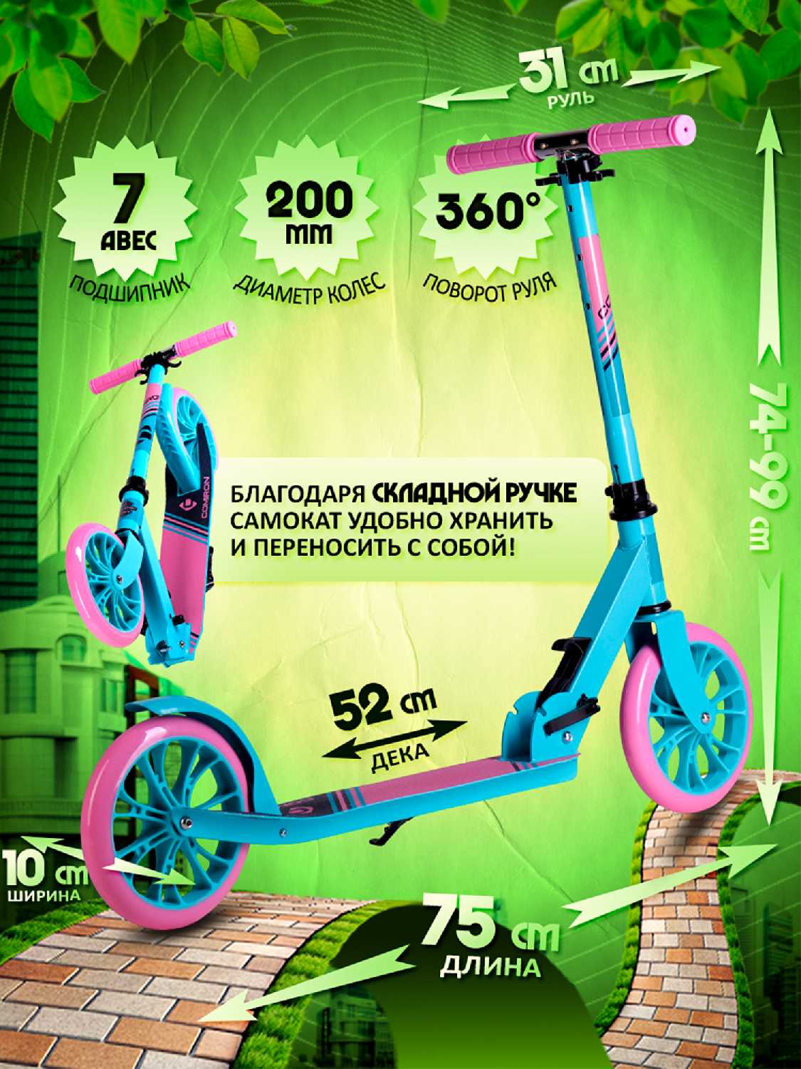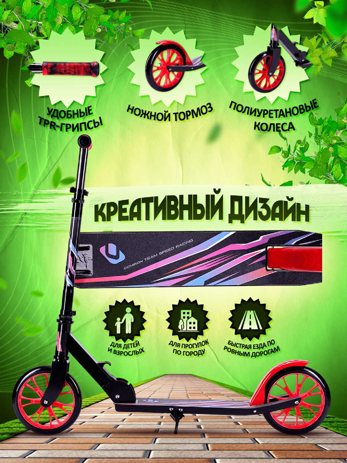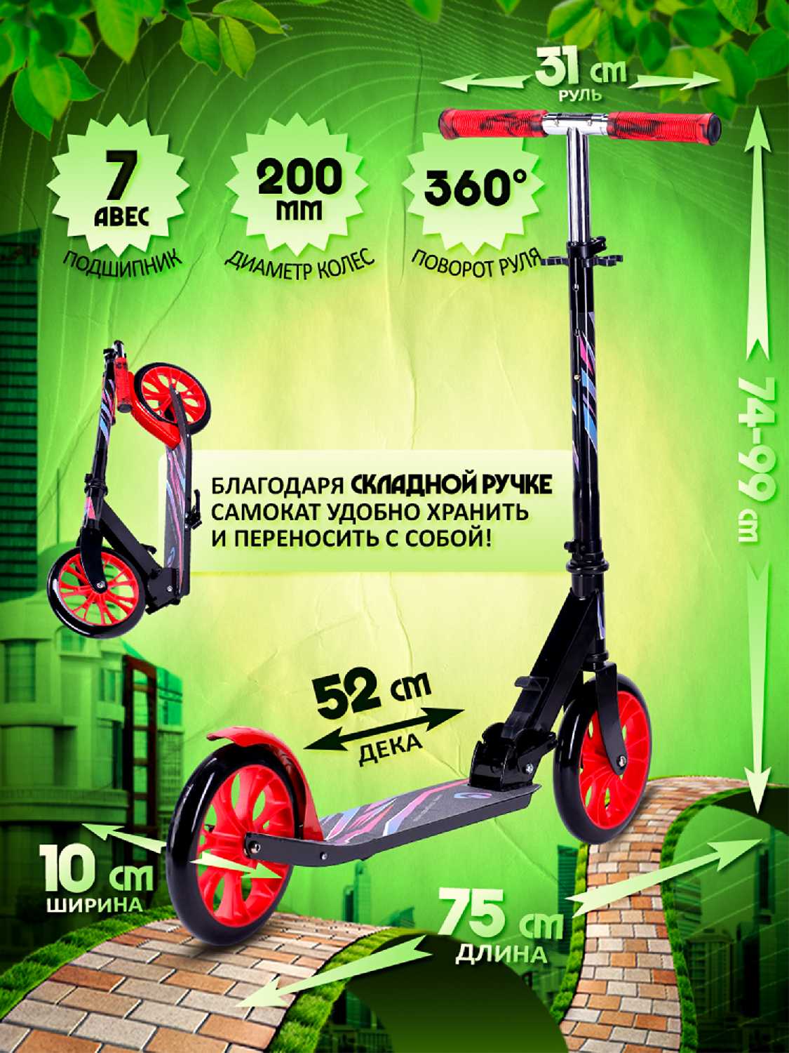 - Большие колеса и качественные подшипники обеспечивают плавный ход и высокую скорость, что подтверждается отзывами о "быстром" самокате.