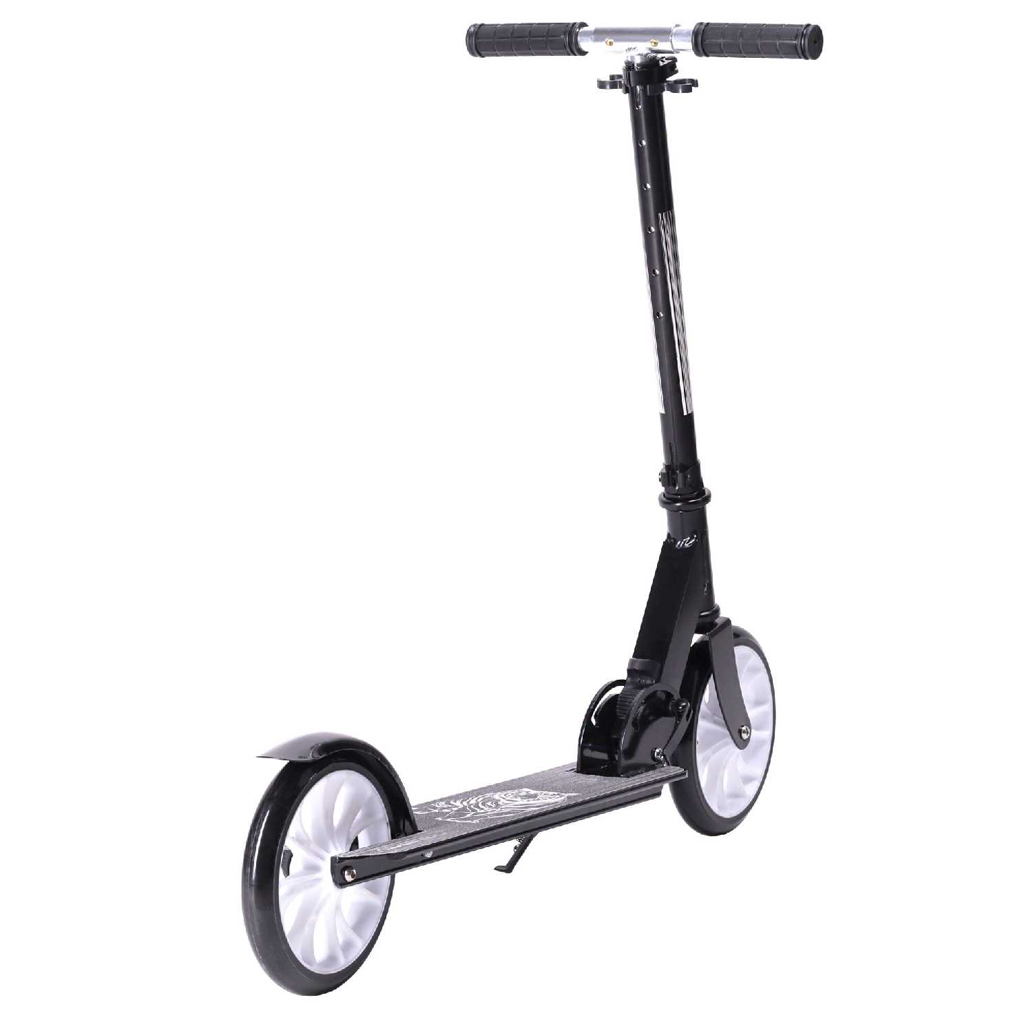 Эксплуатационные характеристики и управление: Эксплуатационные качества самоката формируют его образ как скоростного, но требующего осторожности средства передвижения для детей. Большие колёса в сочетании с хорошими подшипниками, по единодушному мнению пользователей, обеспечивают высокий накат и существенную скорость, превосходящую ожидания для данной категории товаров. Эта особенность делает самокат привлекательным для поездок в школу, так как позволяет ребёнку экономить время и не опаздывать, но одновременно диктует обязательное использование защитной экипировки на начальном этапе. Тормозная система, реализованная в виде крыльного тормоза, подвергается критике за низкую эффективность — пользователи характеризуют её действие как простое скольжение по поверхности колеса без создания достаточного усилия для быстрой остановки. Управляемость самоката осложнена тугым ходом руля, который, по некоторым данным, не был смазан на заводе, а также возможным отклонением рулевой стойки от оси, что создаёт дисбаланс при движении. Для ребёнка весом 50 кг самокат оказывается вполне приемлемым по динамическим характеристикам, подтверждая свою функциональность для ежедневных городских поездок. Лёгкость конструкции, отмеченная многими, является палкой о двух концах: с одной стороны, она позволяет детям самостоятельно складывать и переносить его, а с другой — косвенно указывает на общую облегчённость и, возможно, хлипкость конструкции. Отсутствие штатной блокировки руля в сложенном состоянии создаёт неудобства при переноске, так как дека свободно болтается и может задеть окружающих, например, в общественном транспорте. Подножка, присутствующая в конструкции, добавляет удобства для кратковременных остановок, но не компенсирует недостатков в базовых системах управления и безопасности.