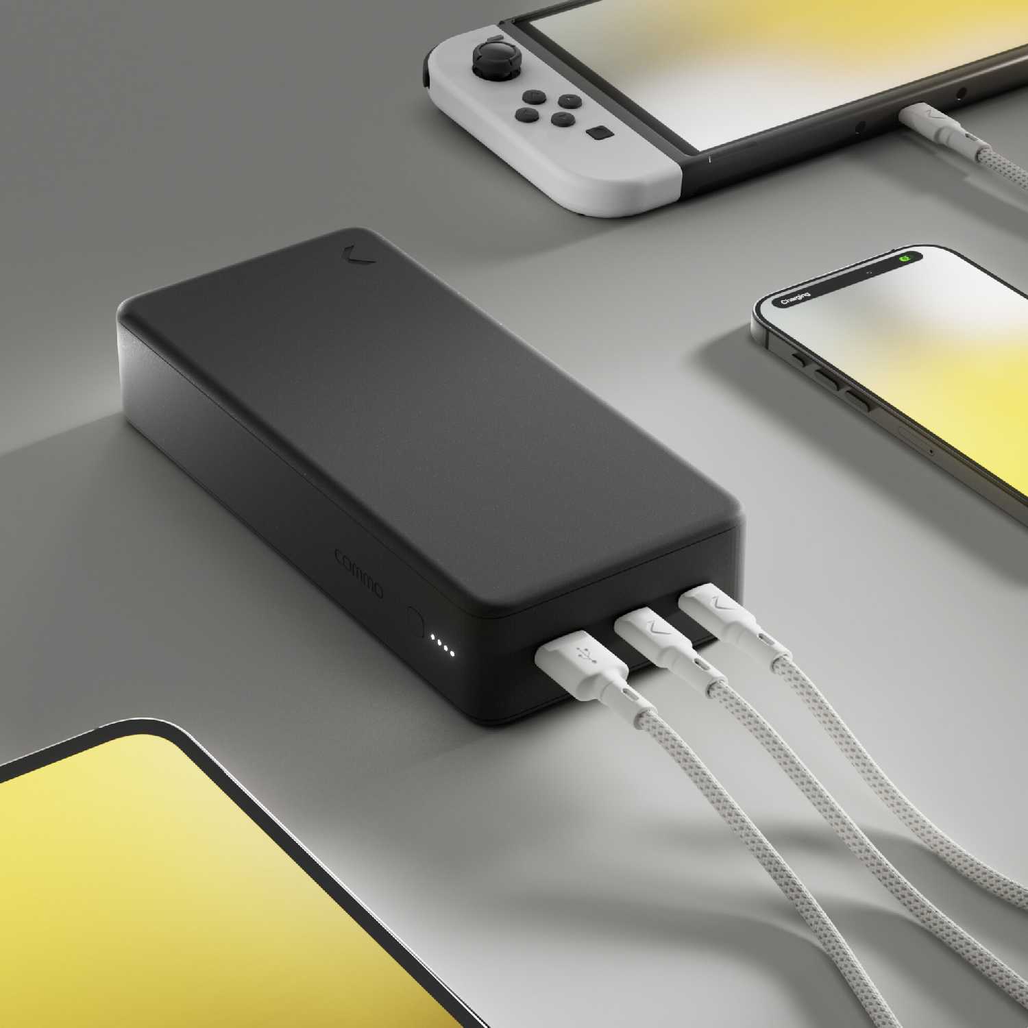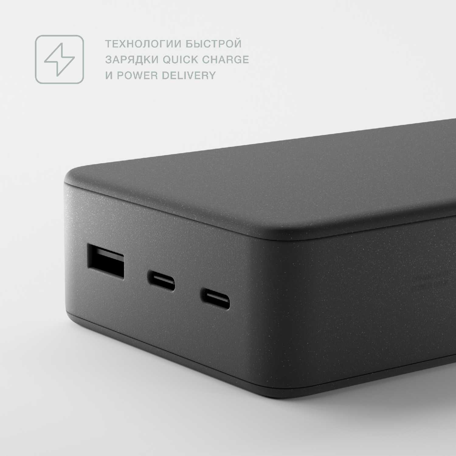 - Одновременная зарядка трёх гаджетов (ноутбук, планшет, телефон) без отключения быстрой зарядки благодаря двум USB-C портам.