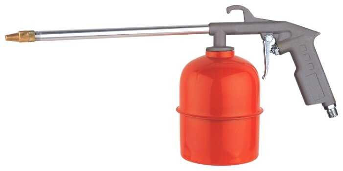 Покупала эту модель по скидкам. Пневмопистолет имеет год официальной гарантии от производителя. Изготовляет такие аппараты Китай. Мне пистолет понадобился для мойки. Он удобен тем, что имеет длинный носик и может проникать в труднодоступные места. В комплекте идет вместительный бачок. Благодаря ему нужно реже прерывать процесс мойки и доливать воду.