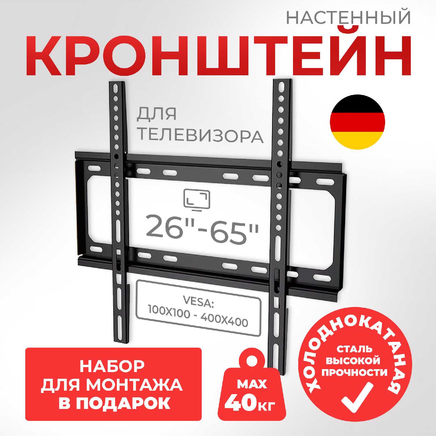 - Подходит для ТВ и мониторов разных размеров (32-65 дюймов).