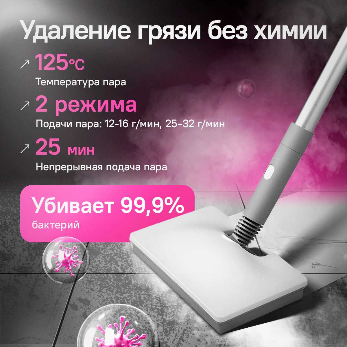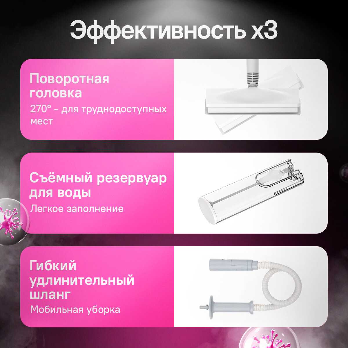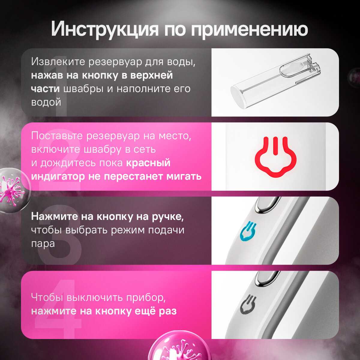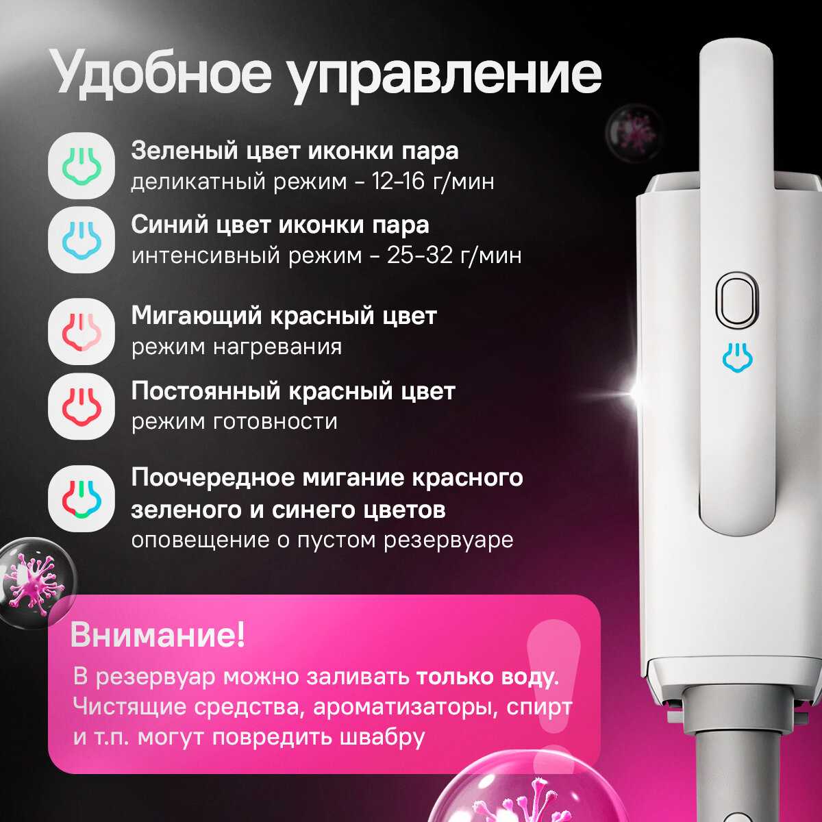 Работа с водой и паром: Объем резервуара в 360 мл оценивается как маловатый, особенно при активном использовании на максимальной подаче пара, что приводит к частым доливам. Расход воды при этом экономный. Нагрев происходит быстро, обеспечивая оперативное начало работы. Швабра не оставляет луж на поверхностях при корректном использовании, что подтверждается в отзывах. Подача пара стабильная и сильная на максимальном режиме, соответствуя заявленной мощности 1500 Вт, хотя фактическое давление в 4.8 бар не упоминается в инструкции и не верифицируется пользователями.