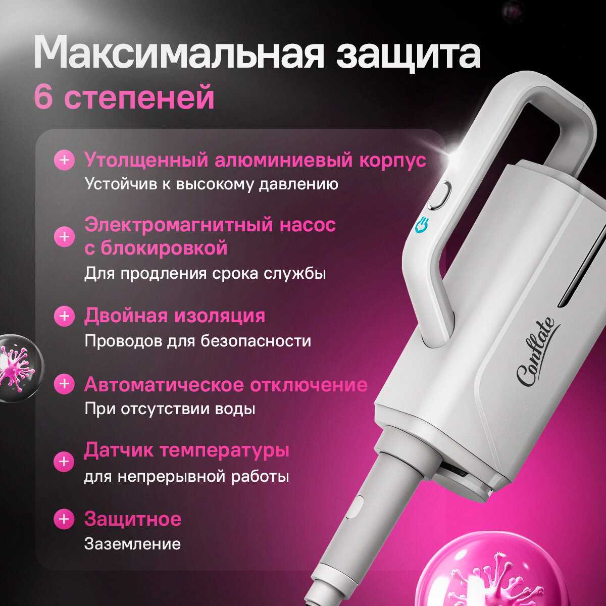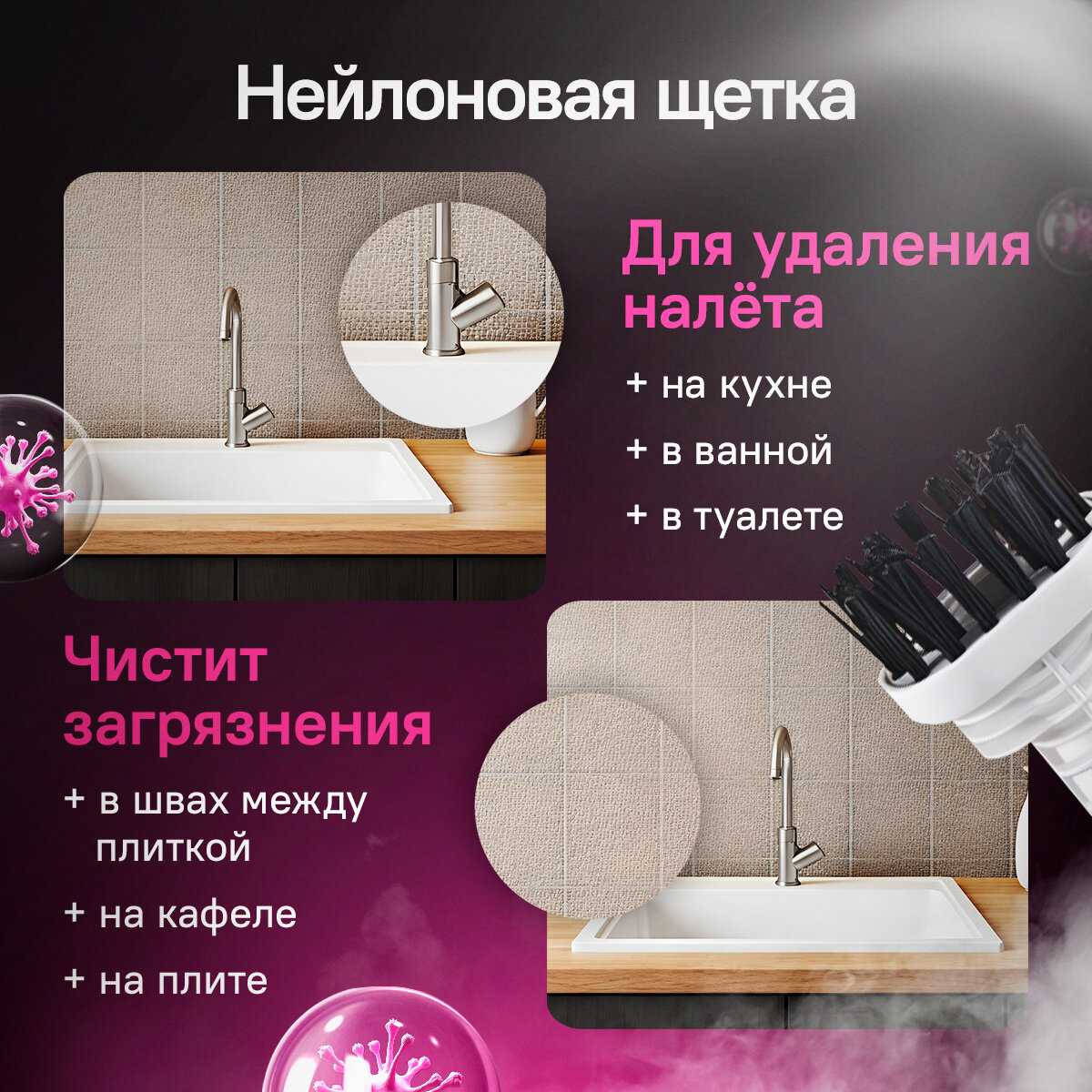 - Высокая мощность обеспечивает быстрое растворение жира и налета на плитке без химии, повышая эффективность уборки на рельефных поверхностях.