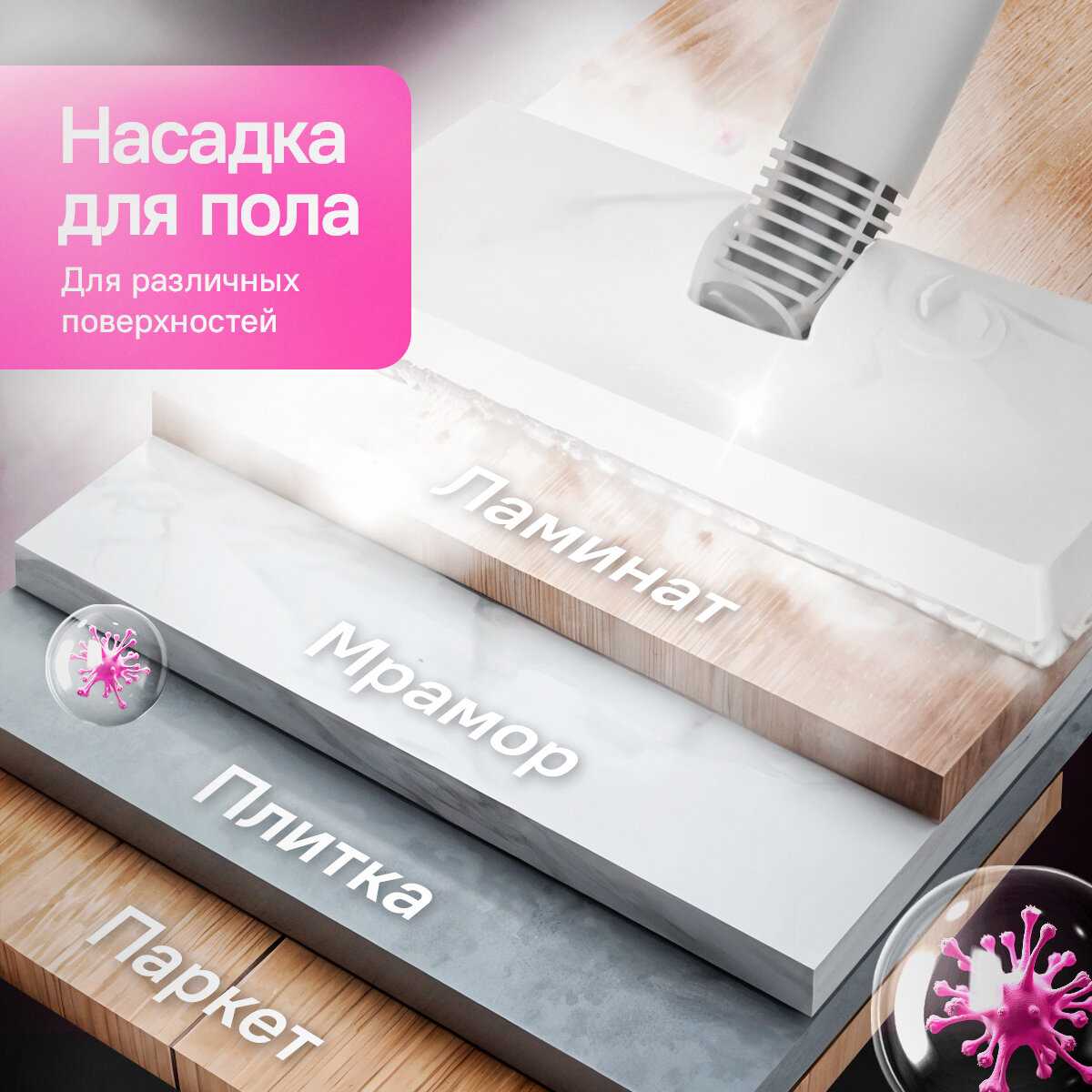 - Регулировка уровней пара (циклическое переключение: нагрев, обычный, сильный) позволяет адаптировать интенсивность для линолеума или ламината, предотвращая повреждения покрытий.