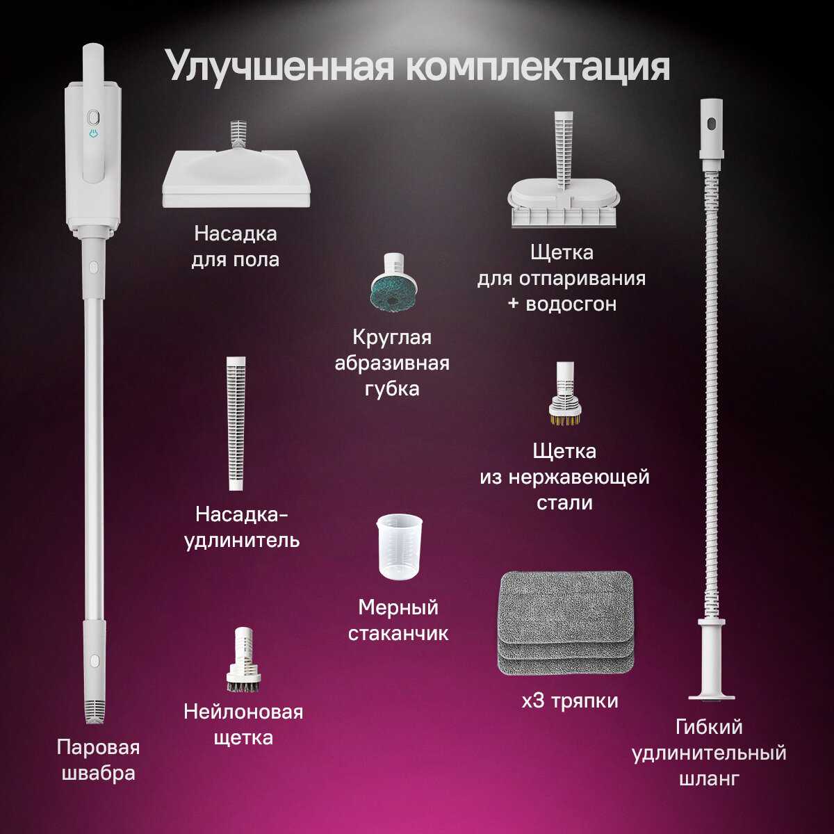 Комплектация включает множество полезных насадок для различных задач: для мытья полов, чистки плитки, обработки швов между плиткой, отпаривания одежды и чистки окон. Пользователи высоко оценивают полноту комплектации, отмечая, что все насадки находят практическое применение. Особенно отмечается эффективность специальных насадок для чистки межплиточных швов и стеклянных поверхностей. -