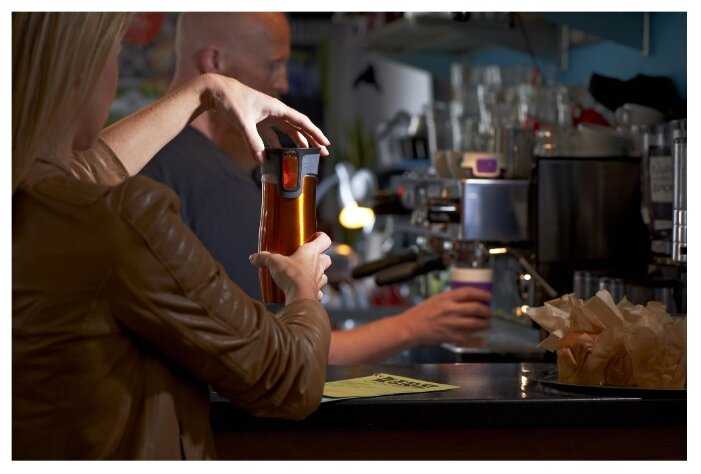 Хорошо держит тепло, удобно пить, когда вторая рука занята - нажав на кнопку, есть стопор для кнопки, чтобы случайно не нажалась в рюкзаке. Лучше брать не цветную, а обычного металлического цвета, а то через год использования появляются царапины на краске (но на функциональность самой кружки это, конечно, не влияет))
