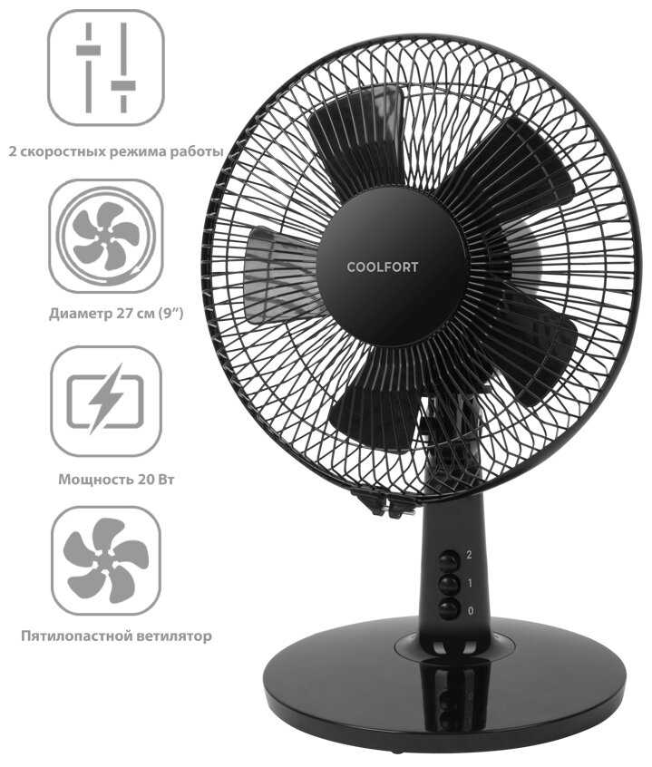 - + Решил купить для маленькой комнаты настольный вентилятор, так как места для напольного вентилятора нет. Просмотрел много моделей по характеристикам и отзывам и остановился на Coolfort CF-2019. В этом вентиляторе привлекло: возможность регулировки по вертикали, «ночной режим», отзывы пользователей.