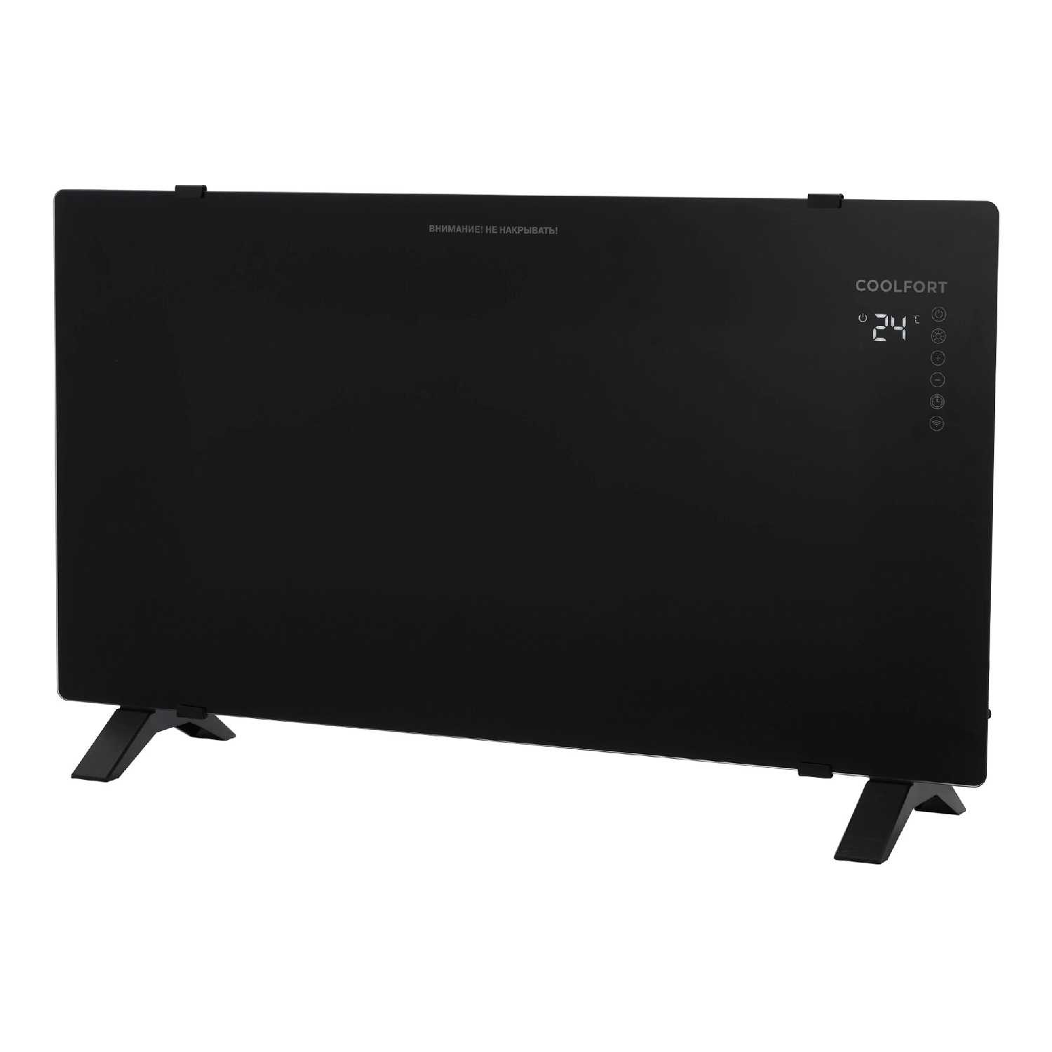 Конвектор имеет стильный дизайн с черным стеклянным фасадом, похожим на зеркальную поверхность или экран телевизора. Он компактный, устойчивый и гармонично сочетается с черной мебелью и техникой в зале. Пользователи называют его современным и эстетичным, подходящим для квартиры или дачи. Корпус не нагревается, что добавляет безопасности в интерьере с детьми. -