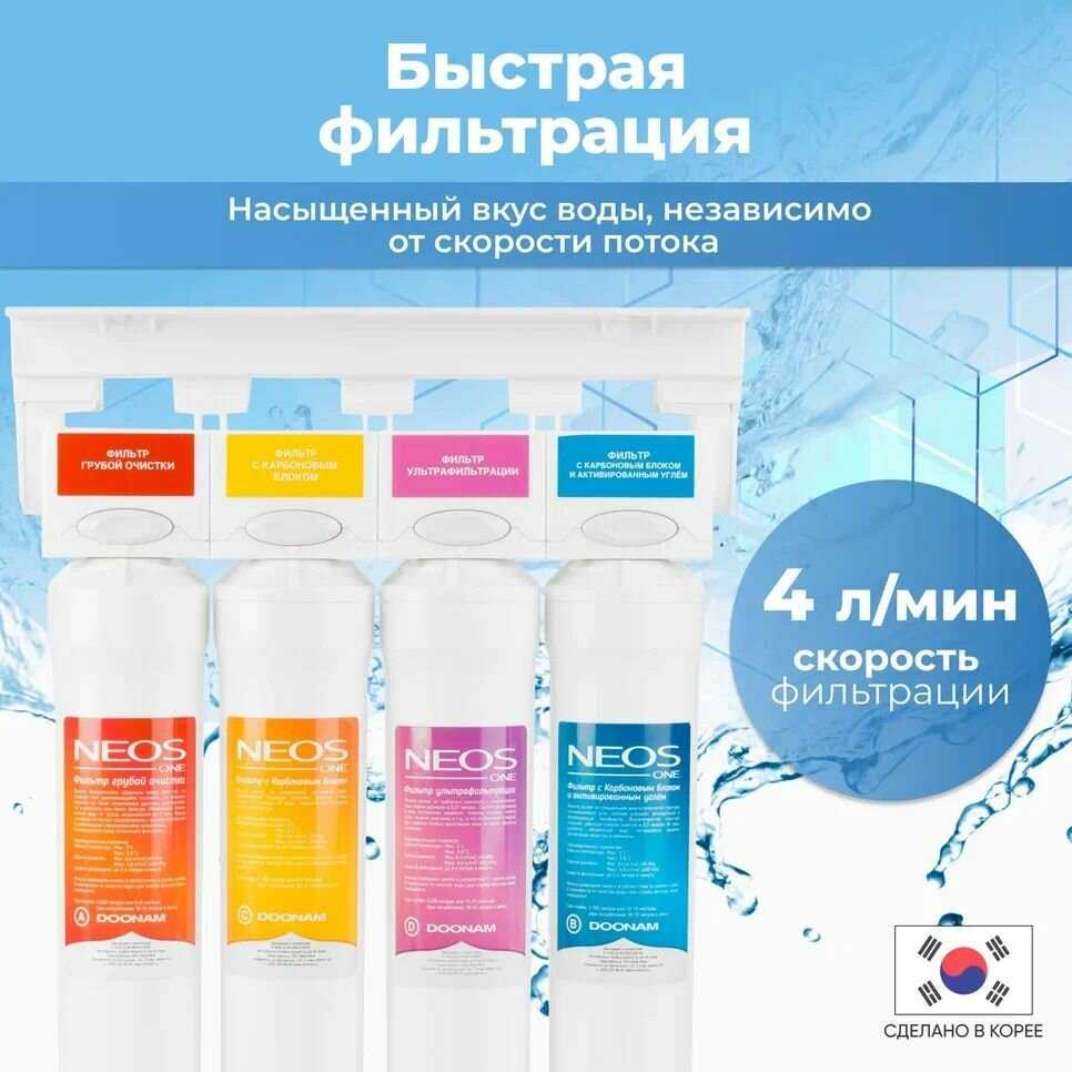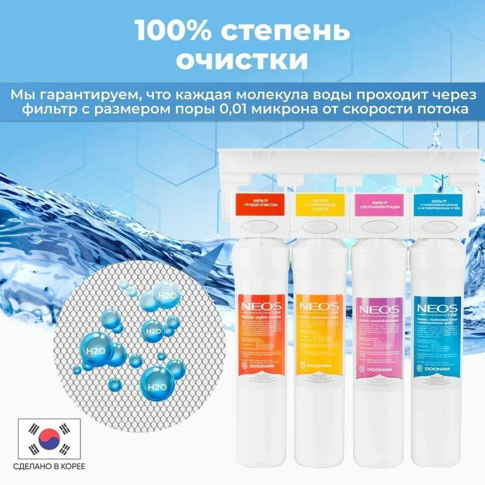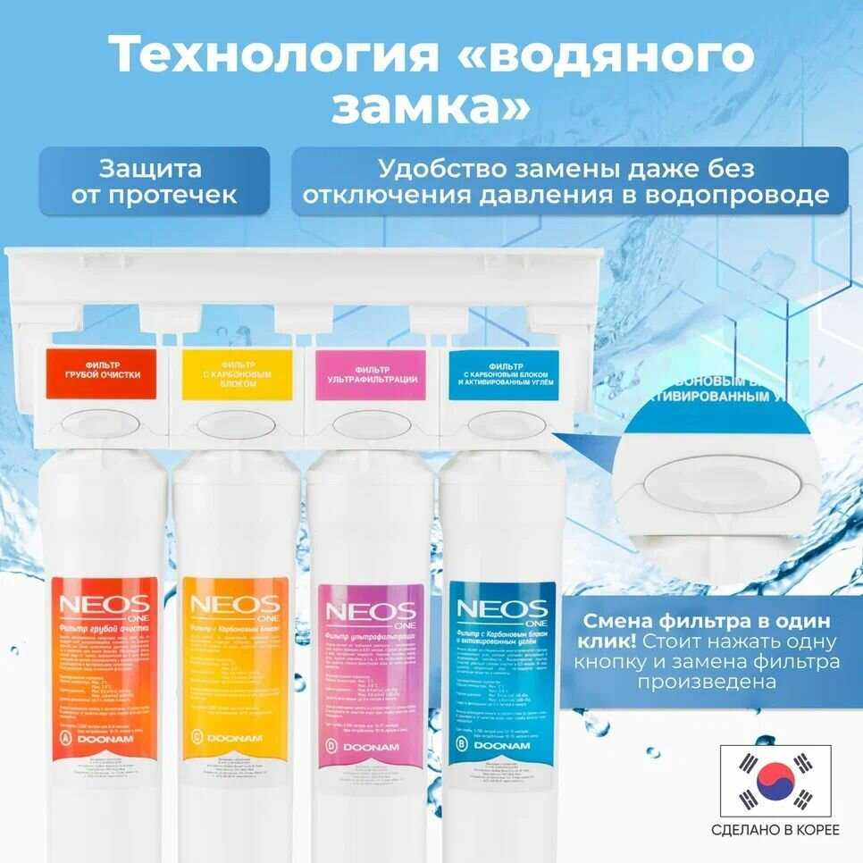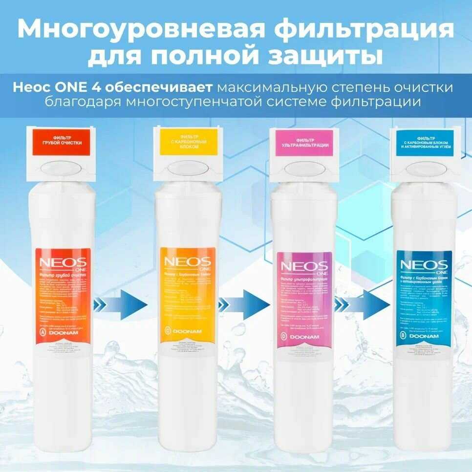 Neos 4 отличная штука. Были ранее и фильтры-кувшины, и накопительного типа. Возня с промыванием комплектующих да и малая скорость фильтрации надоела порядком. Решил остановиться на проточном. Приобрел с 4-мя уровнями очистки. Идеально для нашей воды...весьма спорного качества.