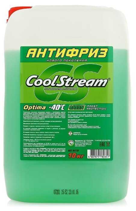 - + Антифриз Coolstream Optima Green покупал для ВАЗ 2109. Охлождает, пока не кипит. На вид по консистенции как вода, между пальцами не маслянистый, резких запахов нет.