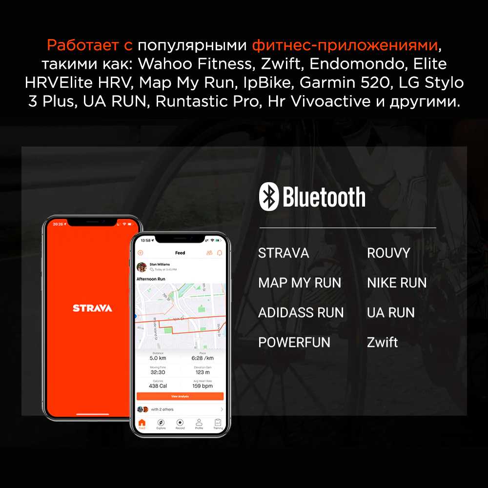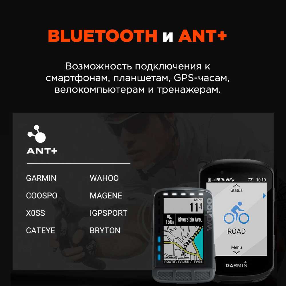 - Поддерживает одновременное подключение к двум устройствам (например, к часам и смартфону) по протоколам Bluetooth и ANT+.