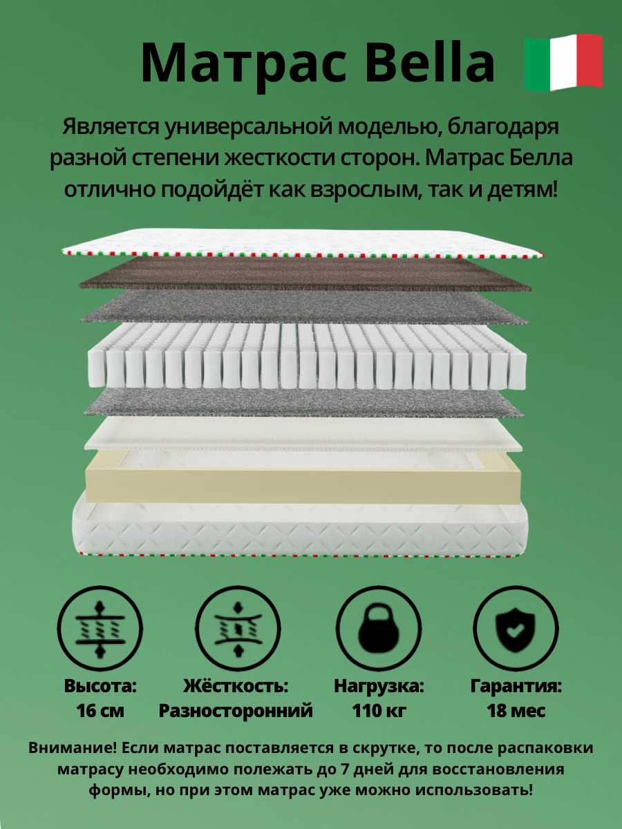 - + Двухсторонний матрас, с разной жесткостью, не большой высоты 16 см. Никаких посторонних запахов не было после распаковки.