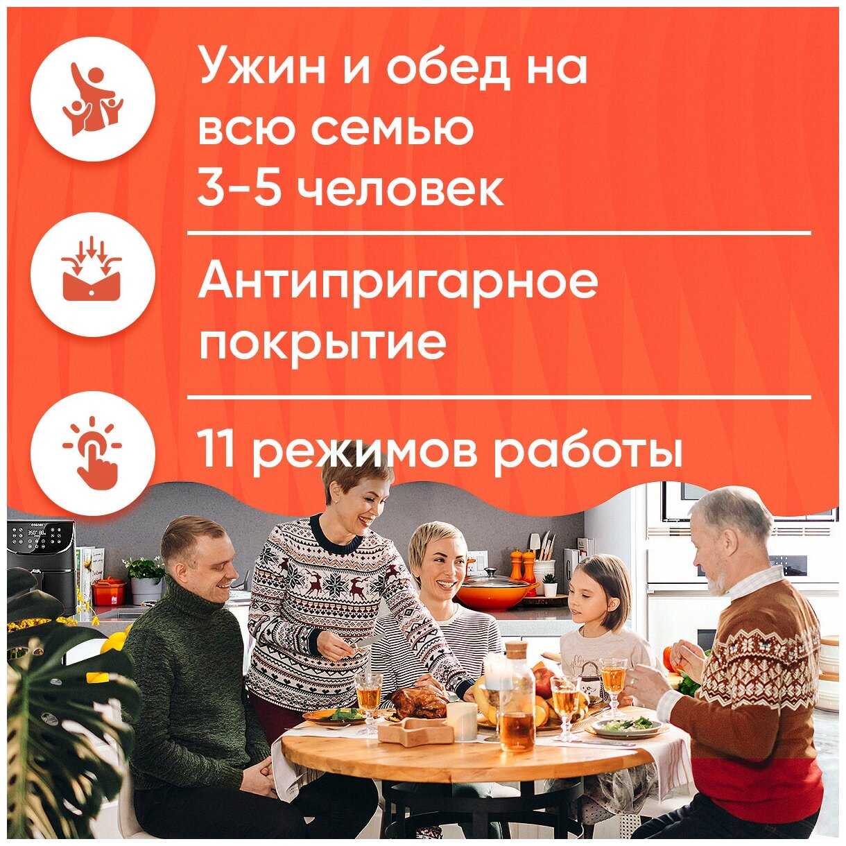 Семьям из 3–4 человек, ценящим быструю (на 30–50% быстрее духовки) и здоровую готовку без масла. Также тем, кто часто экспериментирует с блюдами: от мини-выпечки до сушки фруктов. Не подойдёт для готовки крупных цельных туш или одновременного приготовления 3+ разнотипных блюд — это требует духового шкафа.