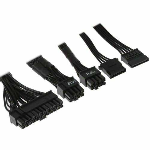 Полумодульная конструкция включает несъемные кабели: 24-pin (материнская плата), 8+8-pin (CPU) и один 6+2-pin (PCI-E). В комплекте поставляются три съемных кабеля: два с раздвоенными PCI-E (6+2 pin) и один с тремя разъемами SATA/Molex. Для подключения 4 видеокарт или специфичных конфигураций могут потребоваться удлинители, так как свободные разъемы на блоке остаются неиспользованными. -