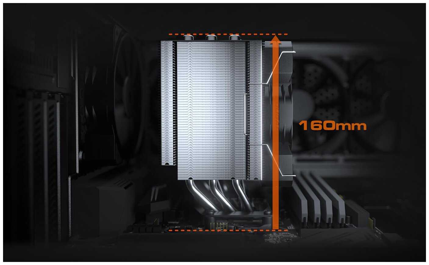 Высота радиатора — 160 мм, что подходит для большинства midi-tower (например, Deepcool Matrexx 55, Zalman Z3 Plus). Минимальное расстояние до боковой стенки корпуса — 2 мм, как в моделях MX-330 с заменой панели на стекло. В компактных корпусах возможны конфликты с VRM-радиаторами материнской платы. -