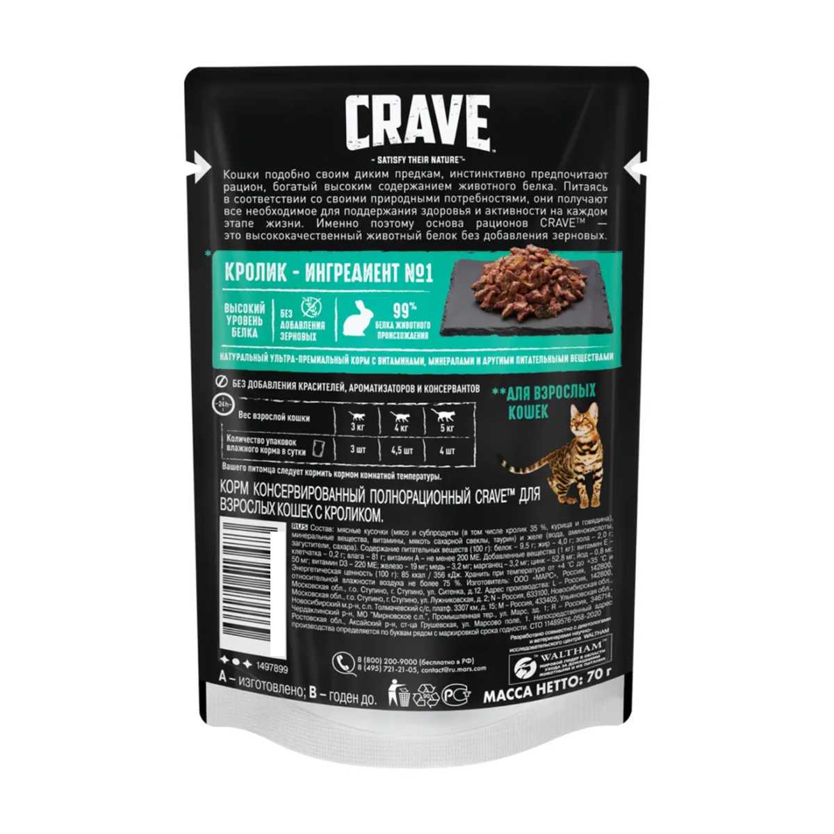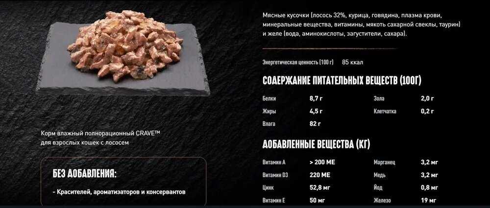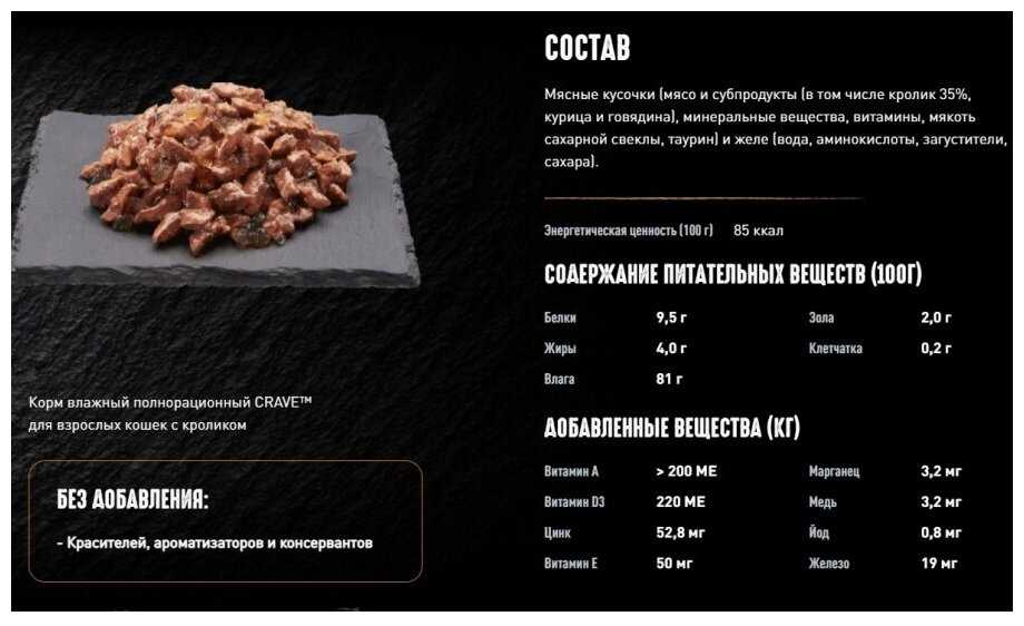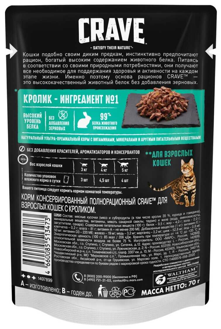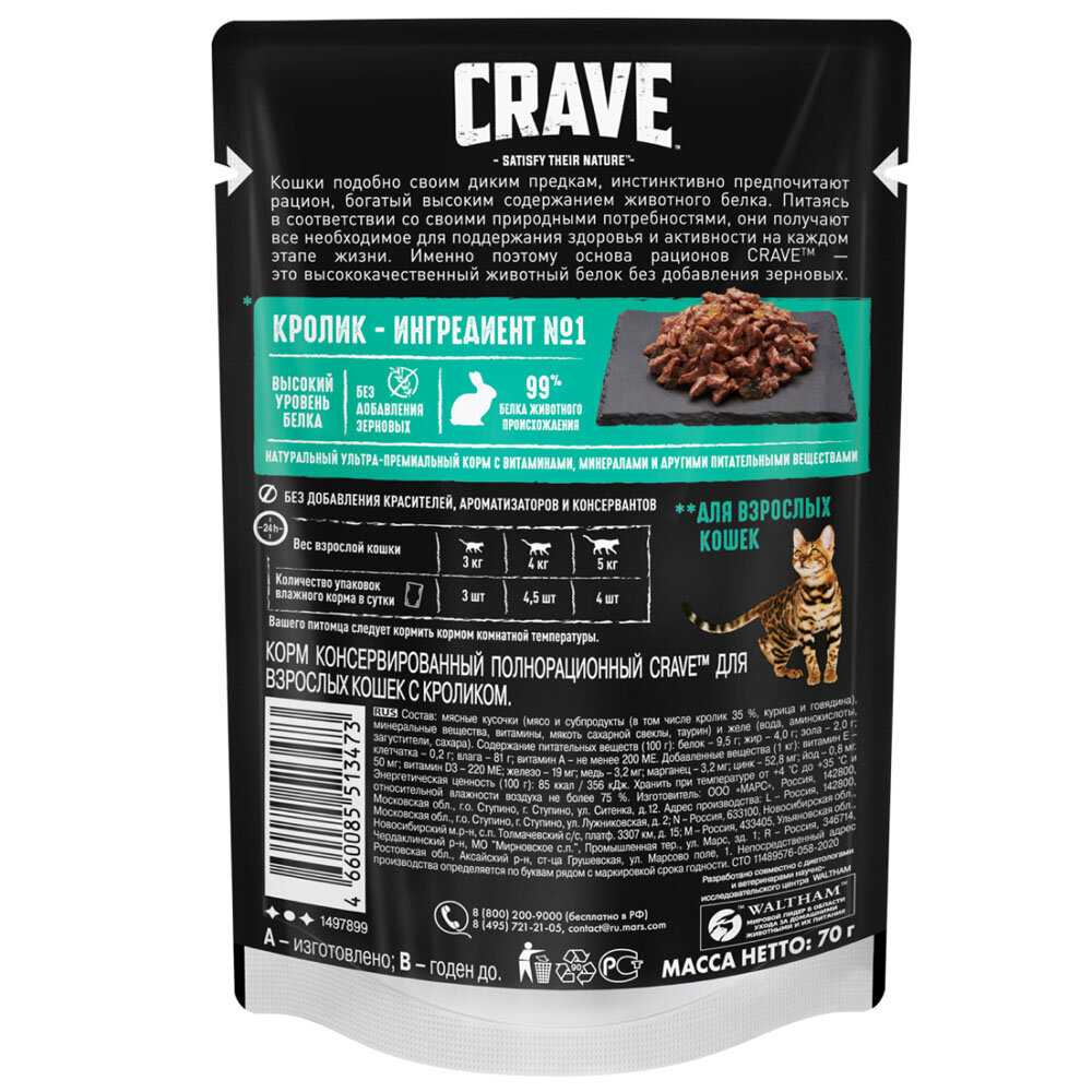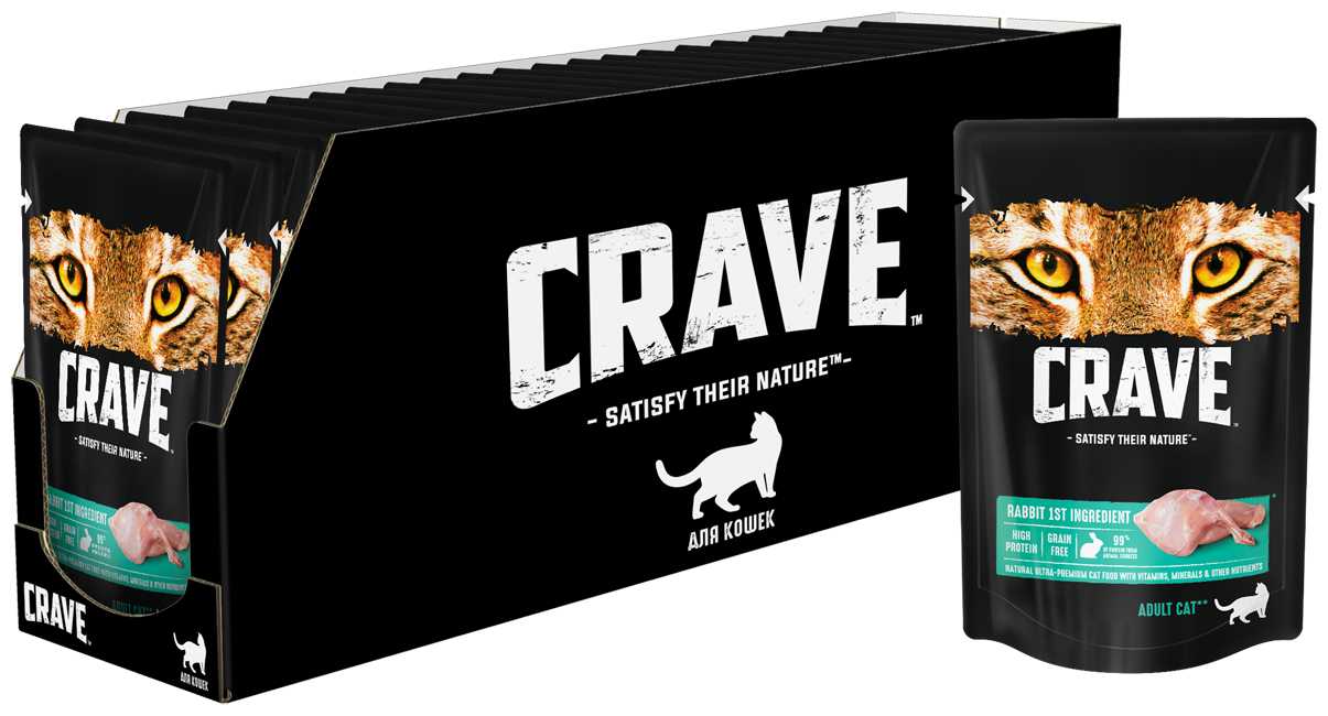 Корм Crave поставляется в удобных порционных упаковках-паучах весом 70 грамм, что пользователи оценивают как практичное решение для точного дозирования и сохранения свежести продукта. Упаковка легко вскрывается, а консистенция корма позволяет ему легко извлекаться без остатка, что упрощает процесс кормления и последующего мытья посуды. К недостаткам относят недостаточную распространенность корма в розничных сетях: его редко можно найти в магазинах шаговой доступности, что вынуждает владельцев делать запасы в онлайн-магазинах, покупая большие упаковки по 30 штук, что, впрочем, оказывается более выгодным экономически. Яркая и информативная упаковка с аппетитными изображениями и подробным составом также отмечена как положительная черта, помогающая при выборе продукта. Некоторые пользователи обращают внимание на то, что аппетит питомцев может незначительно варьироваться от партии к партии, что может быть связано с естественными колебаниями в рецептуре или условиями транспортировки и хранения.