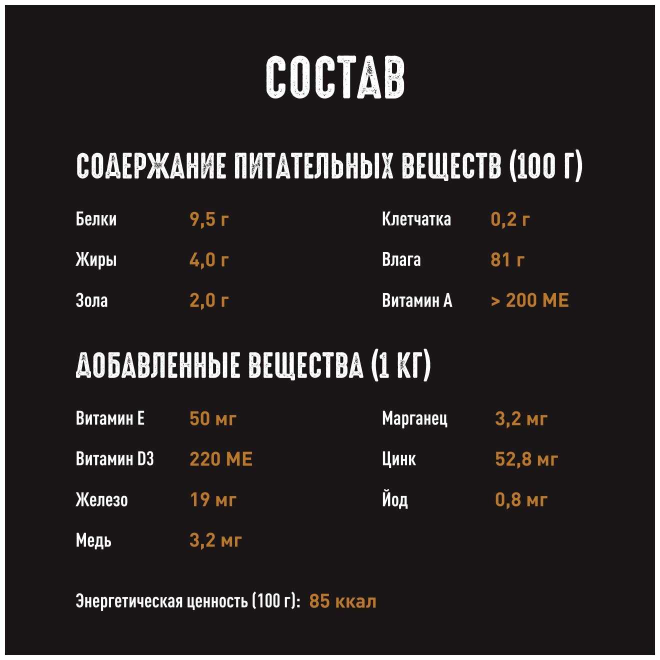 Пищевая ценность : | белки - 95 г, зола - 20 г, жиры - 40 г, клетчатка - 02 г, влага - 81 г |