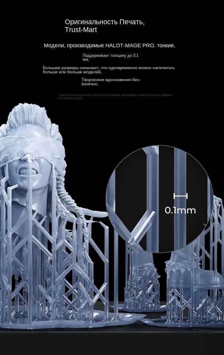 - При очень высокой точности печать идёт очень долго: пример — фигурка ~60 мм при слое 0,01 мм печалась почти сутки.