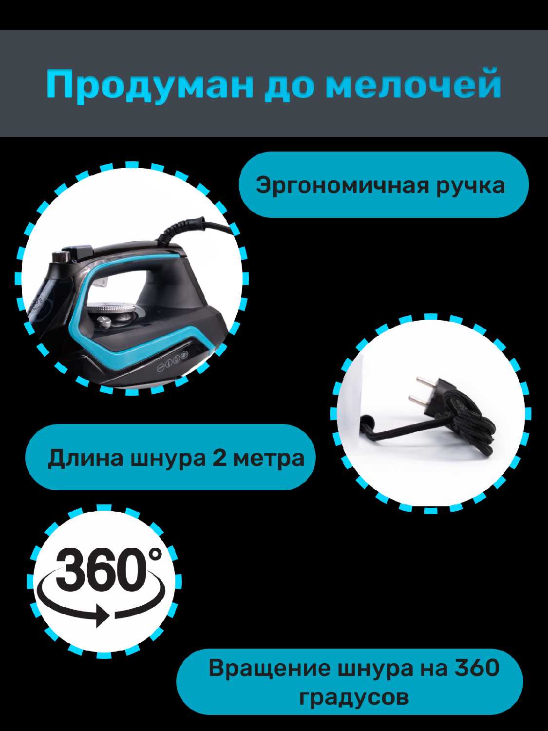 Шнур питания имеет значительную длину, что высоко оценено пользователями в отзывах. Это позволяет свободно перемещать утюг вокруг гладильной доски без ограничений. Качественная изоляция провода обеспечивает дополнительную безопасность эксплуатации. -