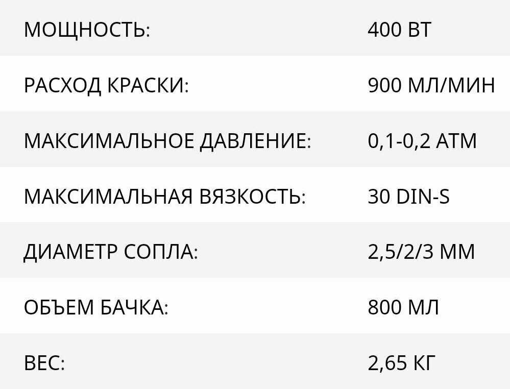| Распыляемый материал : | грунтовка, закрепитель краски, краска, лак, масло, морилка |
