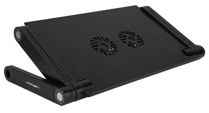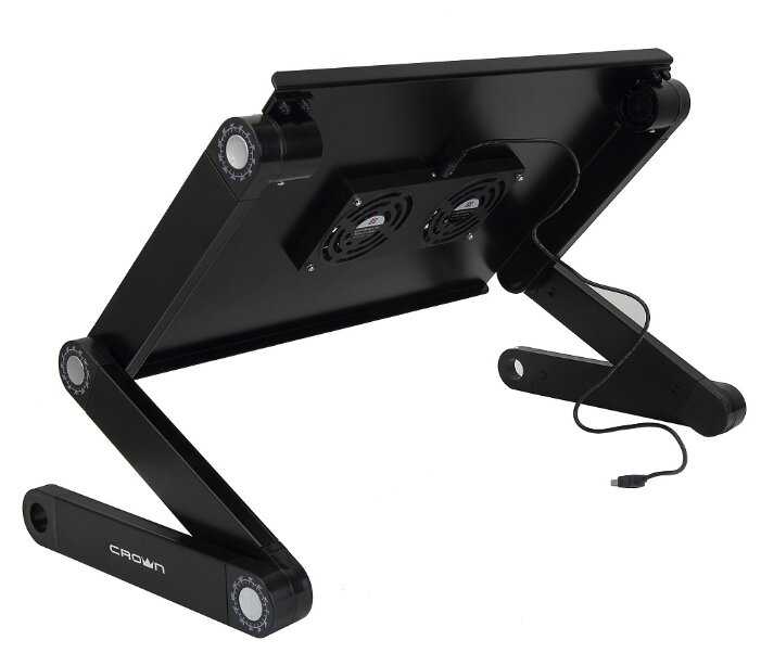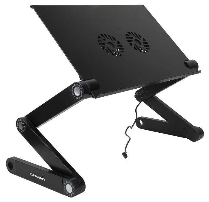 Купил в качестве подарка жене. Имеются независимые регулировки каждого из соединений ножек, Можно даже сделать разные углы - столик будет под углом. Немного не устойчив на мягких поверхностях - думаю это и понятно. При неправильных углах ноут может перевешивать вперед или назад. В целом довольны. Про охлаждение и шум вентиляторов не подскажу - пока не используем - нет необходимости.