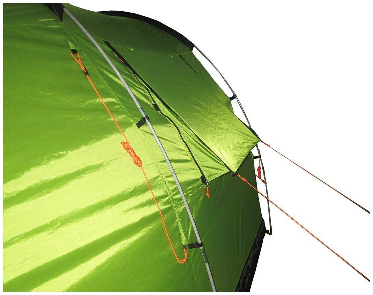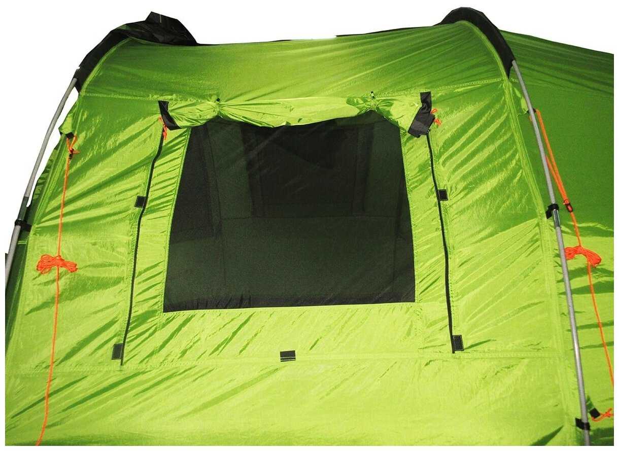 Эргономика и удобство использования: Пространственная организация и функциональность: Палатка высотой 195+ см позволяет стоять в полный рост, а спальный отсек вмещает 4–5 человек (два двухспальных матраса 200×150 см). Тамбур рассчитан на размещение стола, стульев и вещей, но отсутствие карманов для мелочей и крючков снижает комфорт. Сборка занимает 15–20 минут благодаря трем цветокодированным дугам, но для установки требуется минимум два человека – одному не хватает рук для натяжения оттяжек и фиксации колышков. Вес 13–15 кг делает модель пригодной только для автокемпинга.