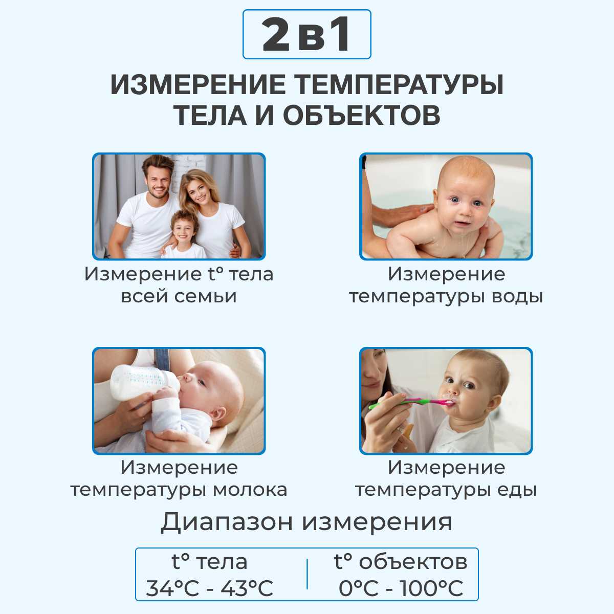В данном термометре есть также функция измерения температуры различных объектов, молодым родителям будет полезным, т.к. можно измерить температуру питания и воду для купания.