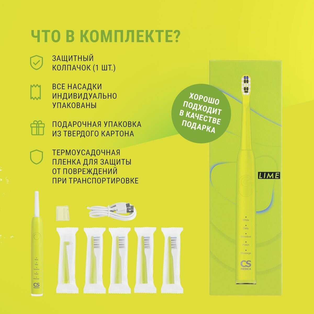 - + Красивая упаковка, щетка звуковая, 4 сменные насадки (одна из них монопучковая), защитный колпачок для насадки, зарядка typeC. У сына сейчас такая черного цвета - чистит отлично, красивая. С фирмой давно знакомы - у детей вначале были детские щетки CS-medica, сейчас пришло время поменять их на взрослый вариант. Эти щетки, по информации на коробке, подходят детям с 12 лет. Но детские щетки у нас до сих пор отлично работают, нужно было только насадки периодично покупать и пару раз за все время поменяли батарейки (была модель без аккумуляторов) . Надеюсь и эта модель со временем не разочарует.