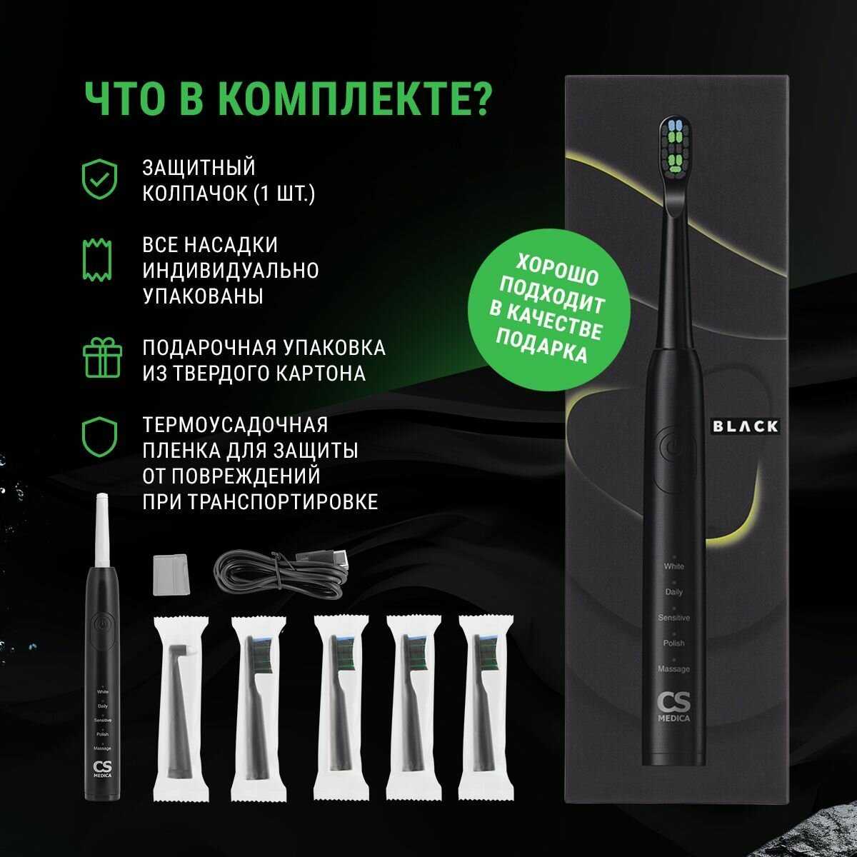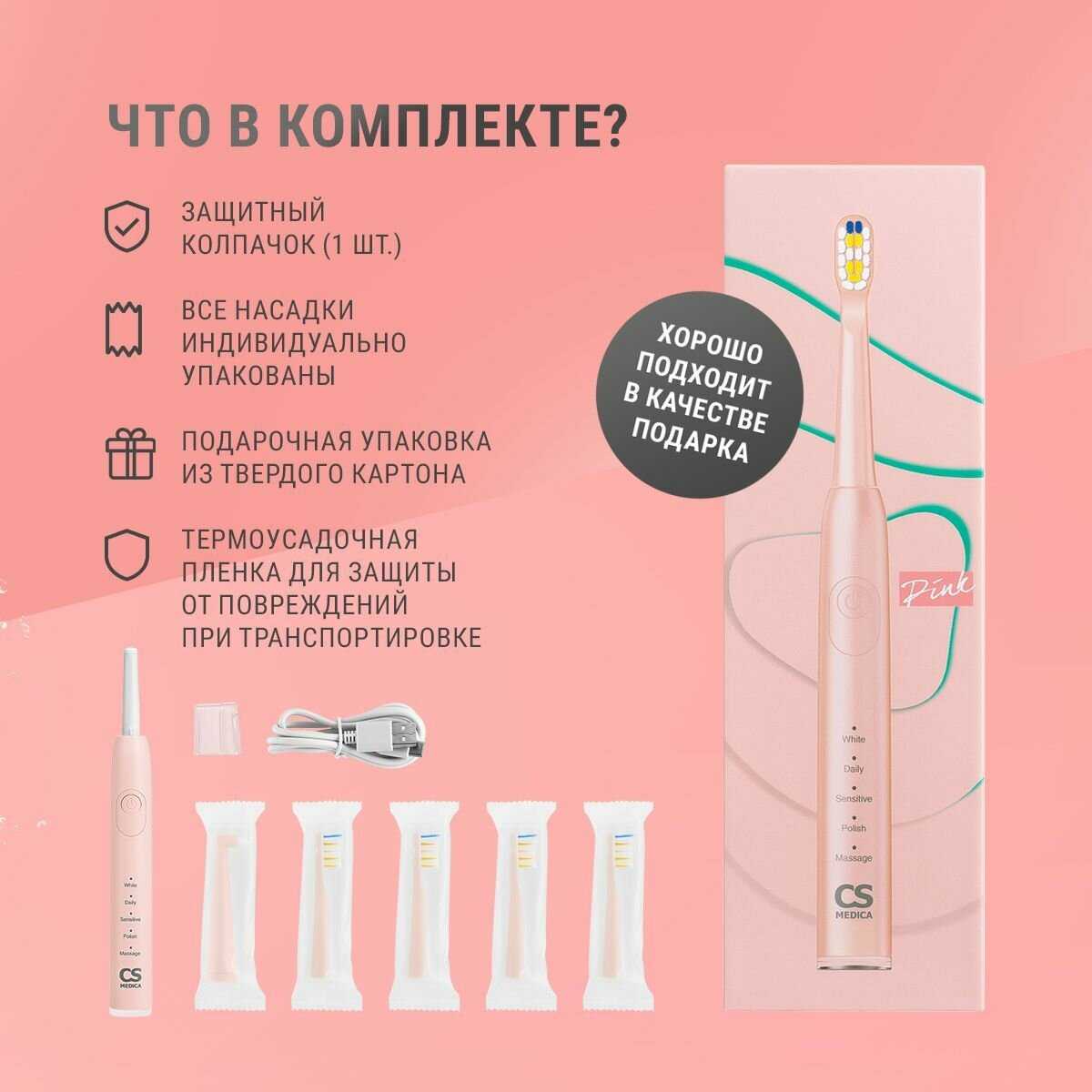 - + Красивая упаковка, щетка звуковая, 4 сменные насадки (одна из них монопучковая), защитный колпачок для насадки, зарядка typeC. У сына сейчас такая черного цвета - чистит отлично, красивая. С фирмой давно знакомы - у детей вначале были детские щетки CS-medica, сейчас пришло время поменять их на взрослый вариант. Эти щетки, по информации на коробке, подходят детям с 12 лет. Но детские щетки у нас до сих пор отлично работают, нужно было только насадки периодично покупать и пару раз за все время поменяли батарейки (была модель без аккумуляторов) . Надеюсь и эта модель со временем не разочарует.