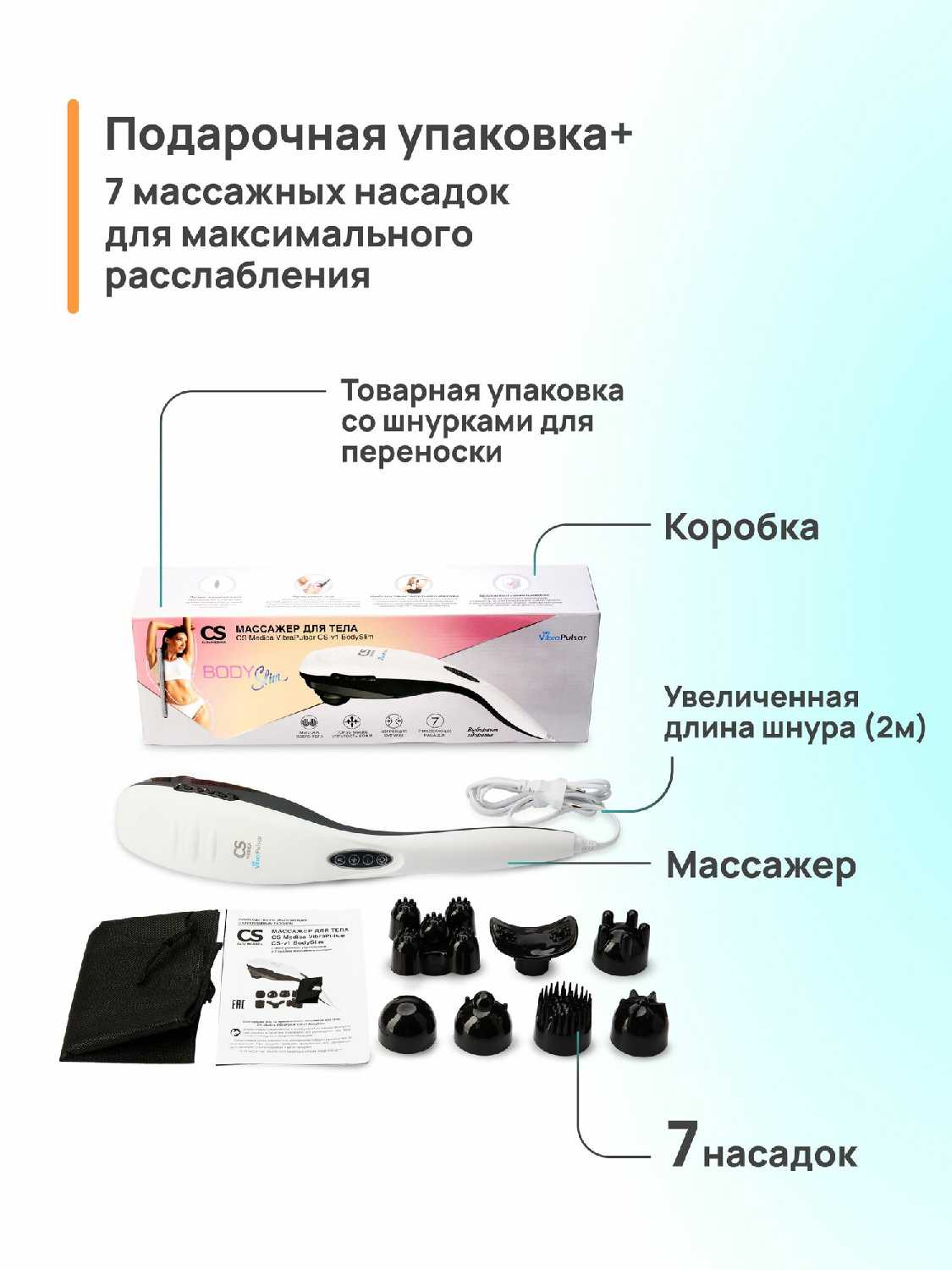 | Подробная комплектация : | Массажер для тела, 7 массажных насадок, чехол для хранения и переноски, руководство по эксплуатации с гарантийным талоном |