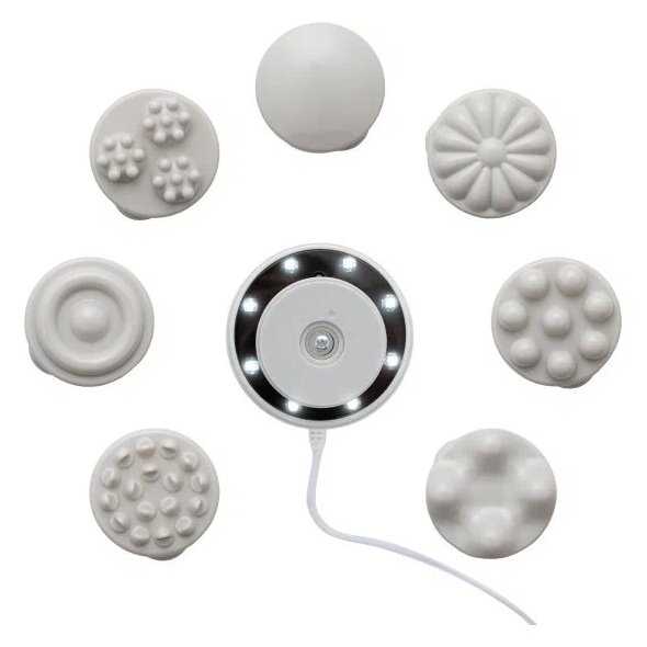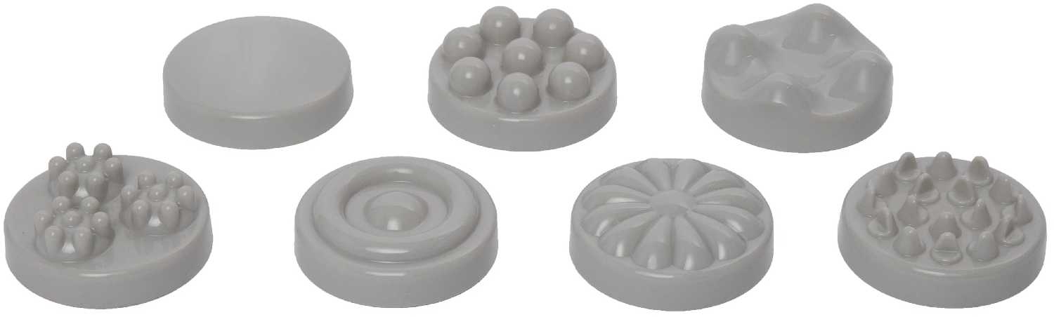 - В комплекте 7 съемных головок разной формы: 4 антицеллюлитных (с шипами и ребрами), 2 для расслабляющего массажа (сферические), 1 для точечного воздействия.