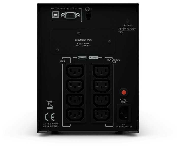 | Особенности : | возможность замены батарей, горячая замена батарей, звуковая сигнализация, поддержка SNMP, фильтрация помех, холодный старт |