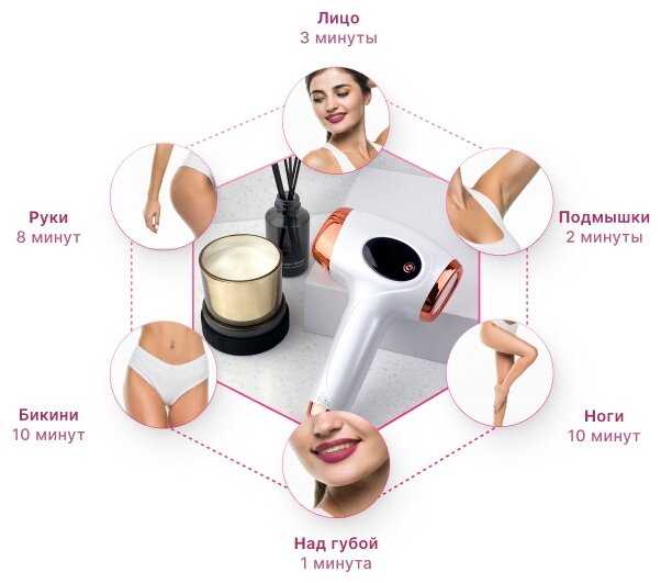 - Пользователи отмечают возможность настройки интенсивности вспышек: 5-7 уровень для чувствительных зон (подмышки), 9 уровень — для ног и бикини.