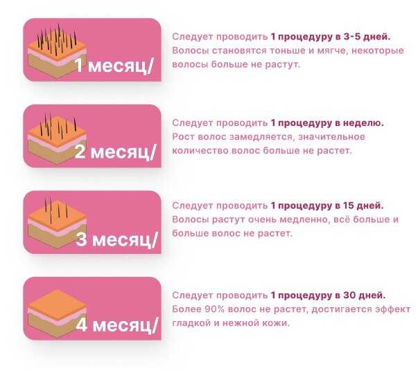 Оптимальная схема: первый месяц — 2-3 процедуры в неделю, далее 1-2 раза в неделю или по мере отрастания волос до 3-4 мм. Каждую зону необходимо обрабатывать 2-3 раза за сеанс. Критически важно соблюдать регулярность — пропуски снижают эффективность. Многие пользователи корректируют график под свою скорость роста волос. -