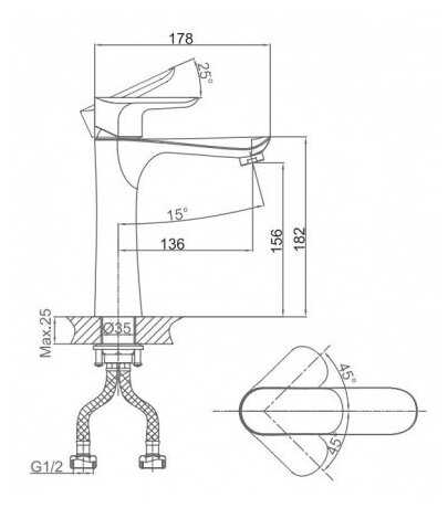 Шланги подключения на 1/2”, что позволяет обойтись без переходников, которые часто приходится ставить для евросмесителей с выходом на 3/8”.