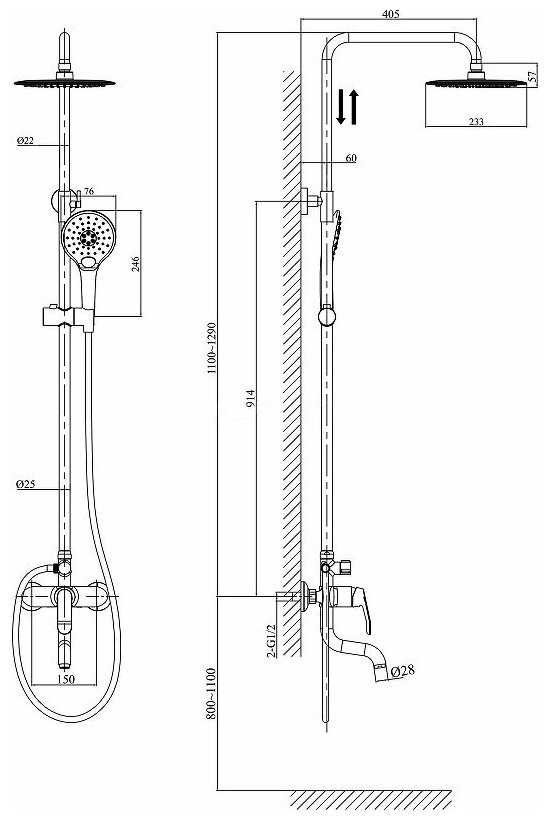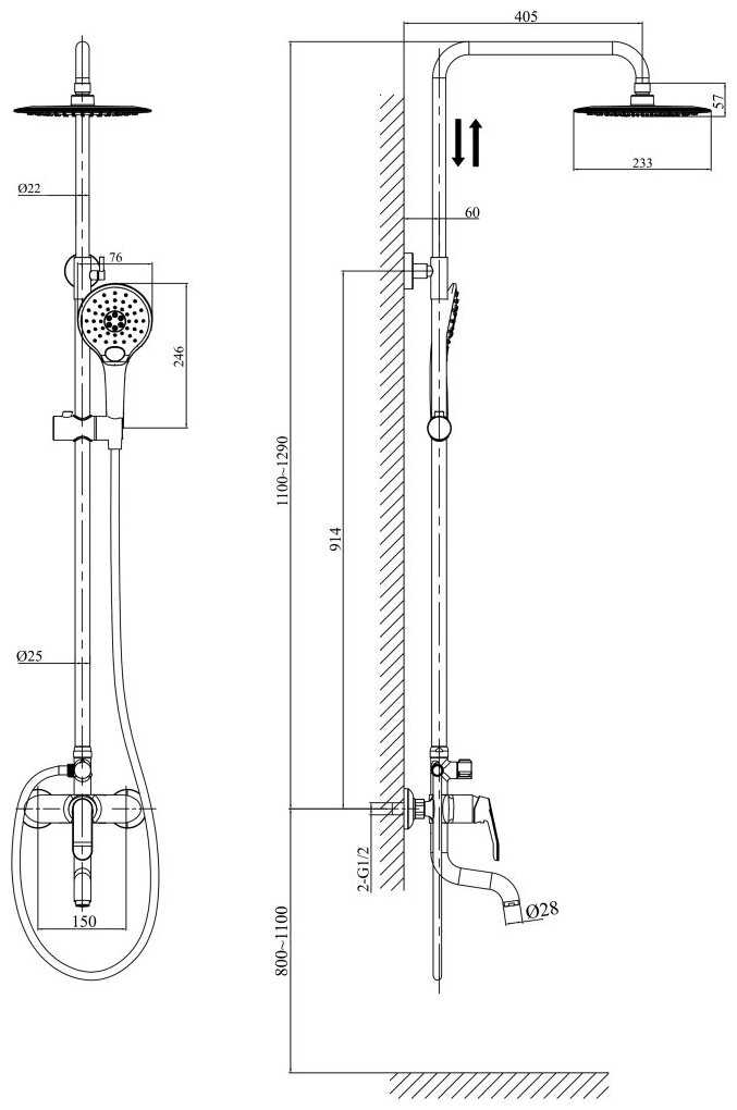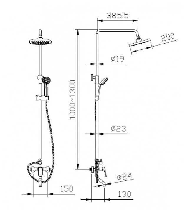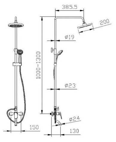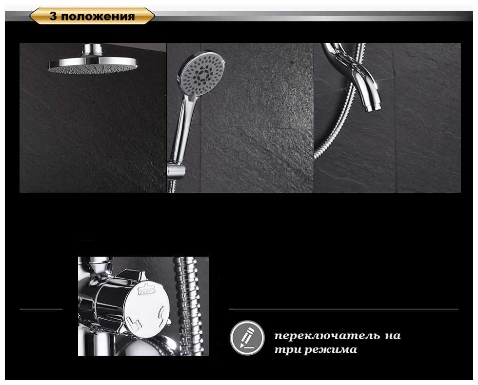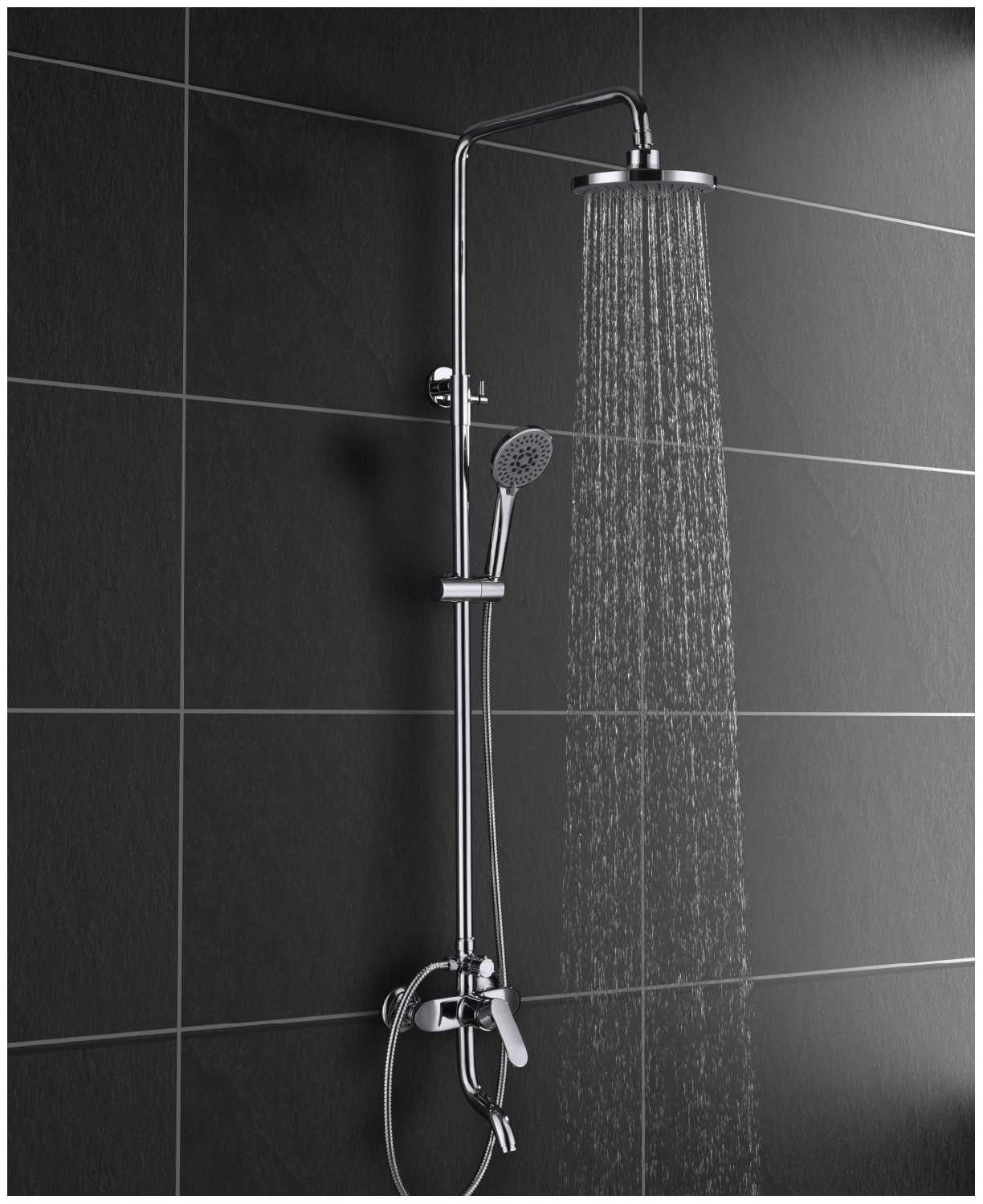 лейка, шланг, верхний душ, душевая стойка, смеситель, кронштейн для верхнего душа, переключатель потоков, душевая штанга