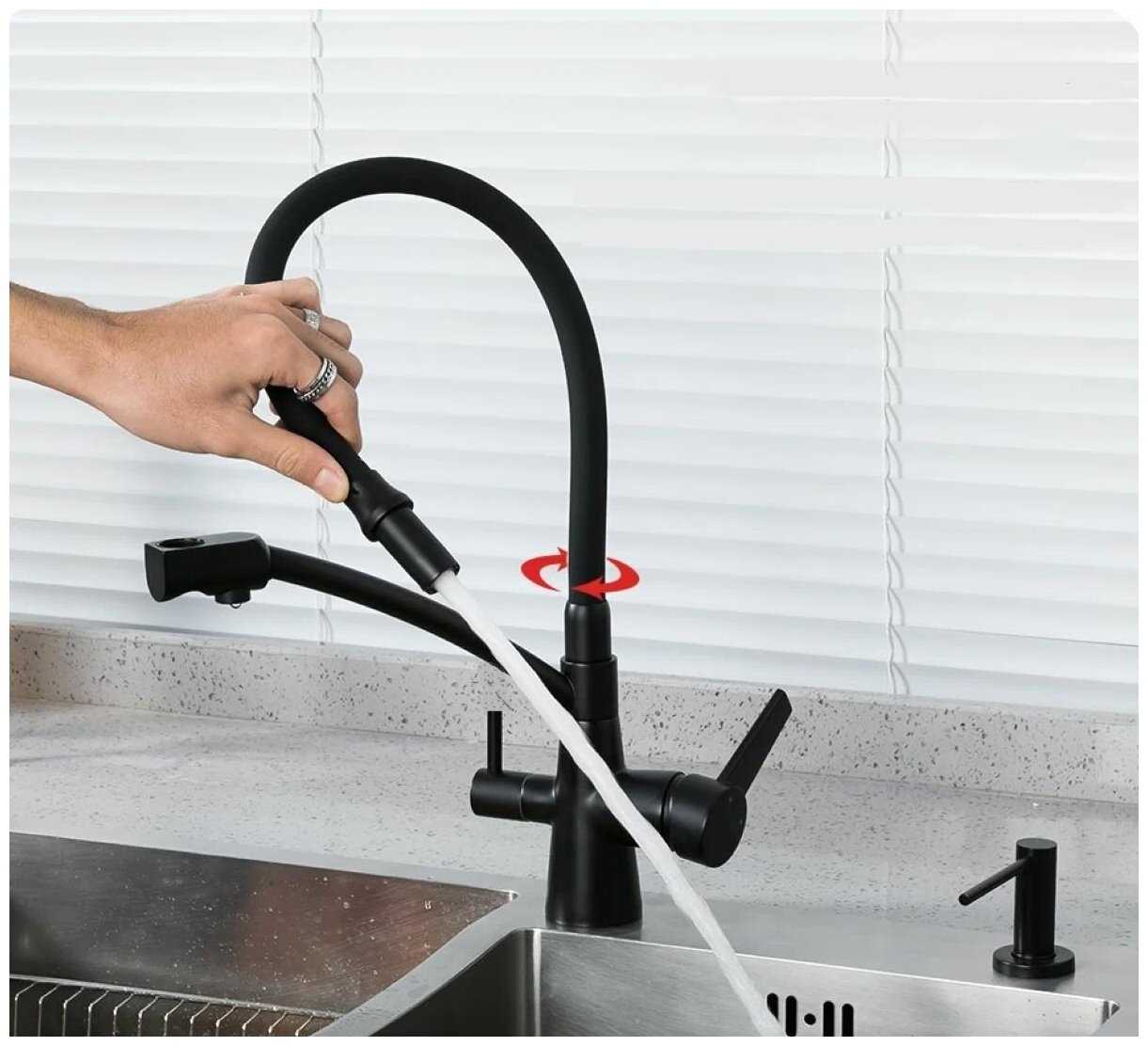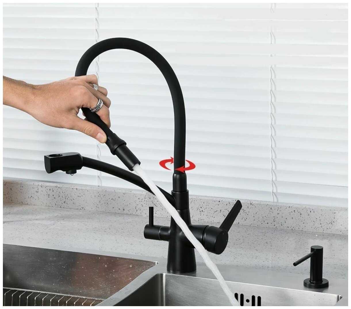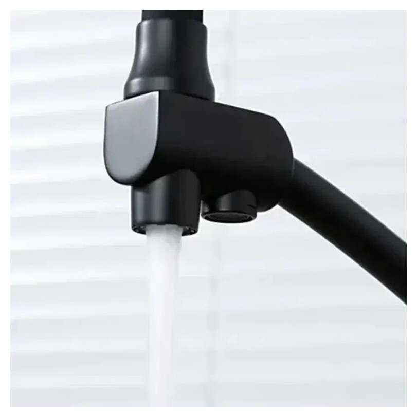 Оптимальные условия эксплуатации и сравнение с аналога: Смеситель оптимален для малогабаритных кухонь с глубокими мойками, где интегрированный фильтр экономит пространство, исключая монтаж отдельного крана. Жесткий шланг эффективен для предварительной очистки посуды от грубых загрязнений перед мойкой. Конструкция превосходит раздельные системы компактностью, но уступает специализированным моделям в эргономике переключения воды. Для пользователей, готовых к частой очистке поверхности, черный цвет становится стильным акцентом. Шланг с фиксацией высоты удобен для семей с разным ростом. В сравнении с аналогами модель выделяется удачной интеграцией фильтра, но проигрывает в долговечности прокладок и фурнитуры. Не подходит для мелких раковин из-за риска разбрызгивания при фиксации на верхней позиции. Требует аккуратного обращения из-за риска сколов эмали.