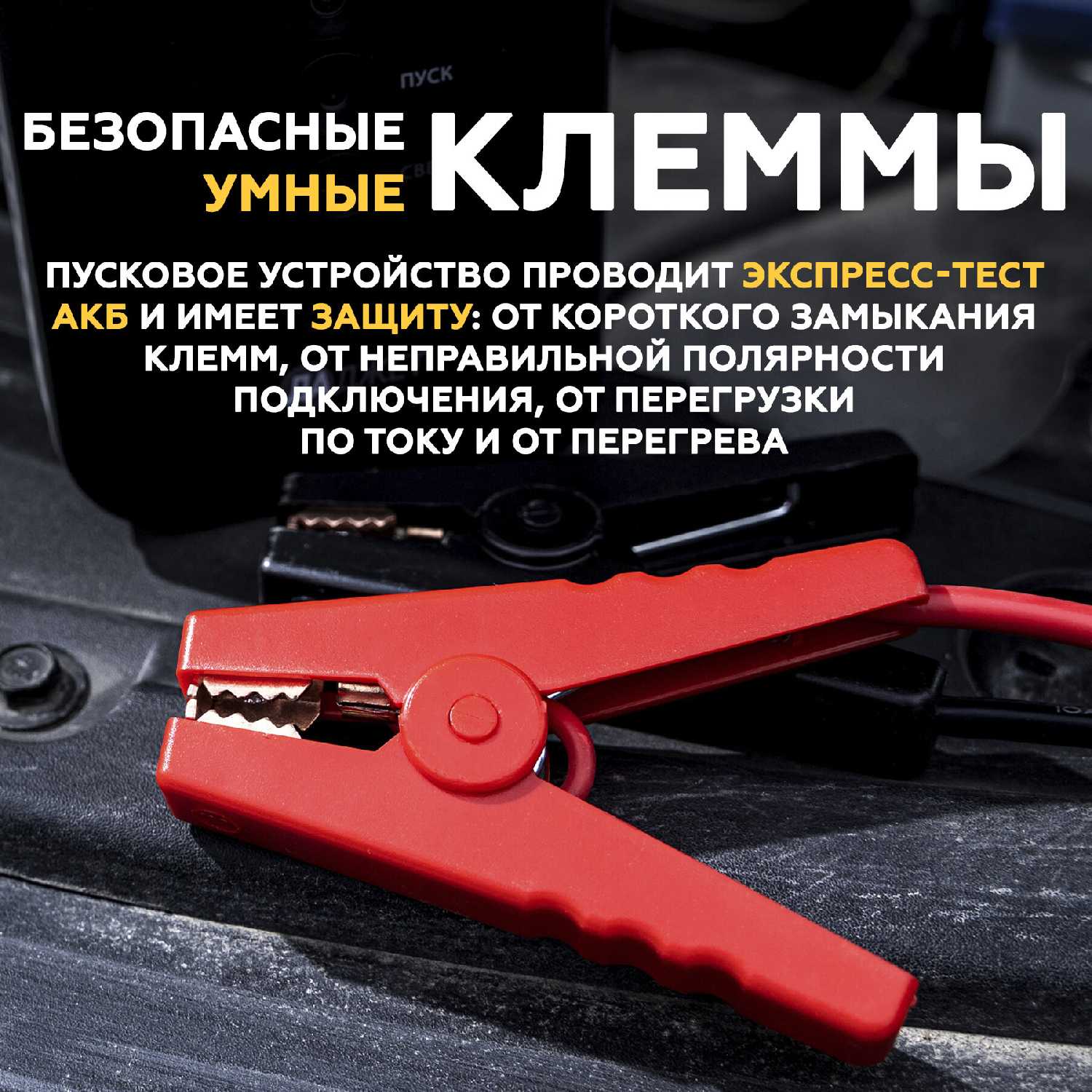 - Оснащена защитой от переполюсовки, которая предотвращает короткое замыкание и повреждение как бустера, так и электроники автомобиля при неправильном подключении клемм.