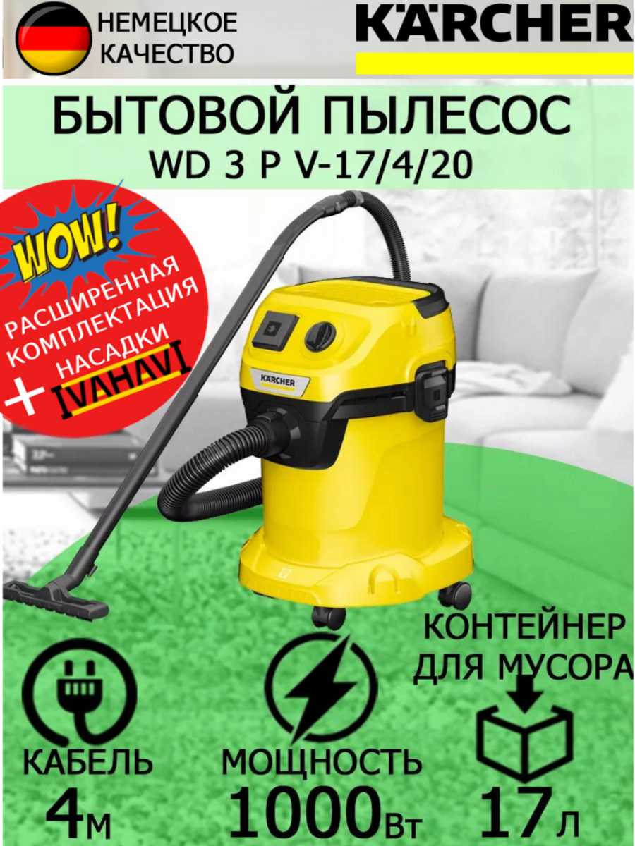 - + Длинный шнур питания, длинный шланг, контейнер для мелочей