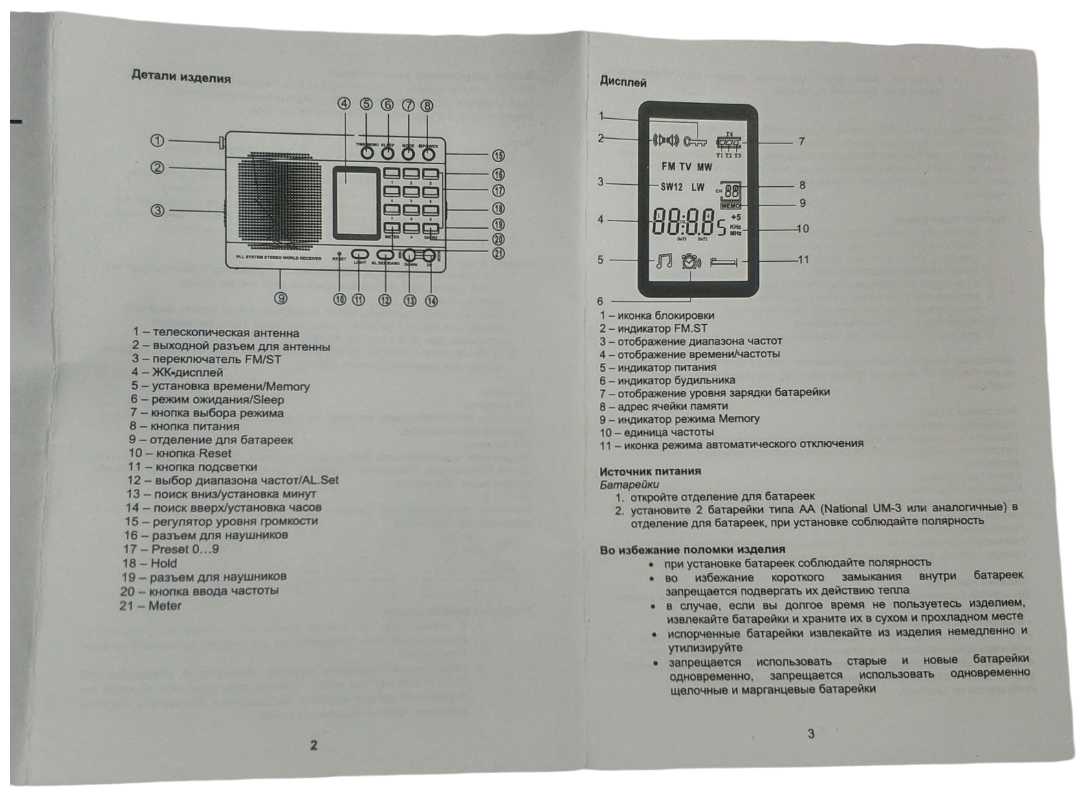 - - при замене аккумуляторов типа АА запомненные радиостанции на кнопках от 1 до 10 сбрасываются