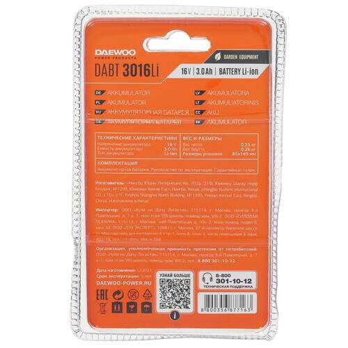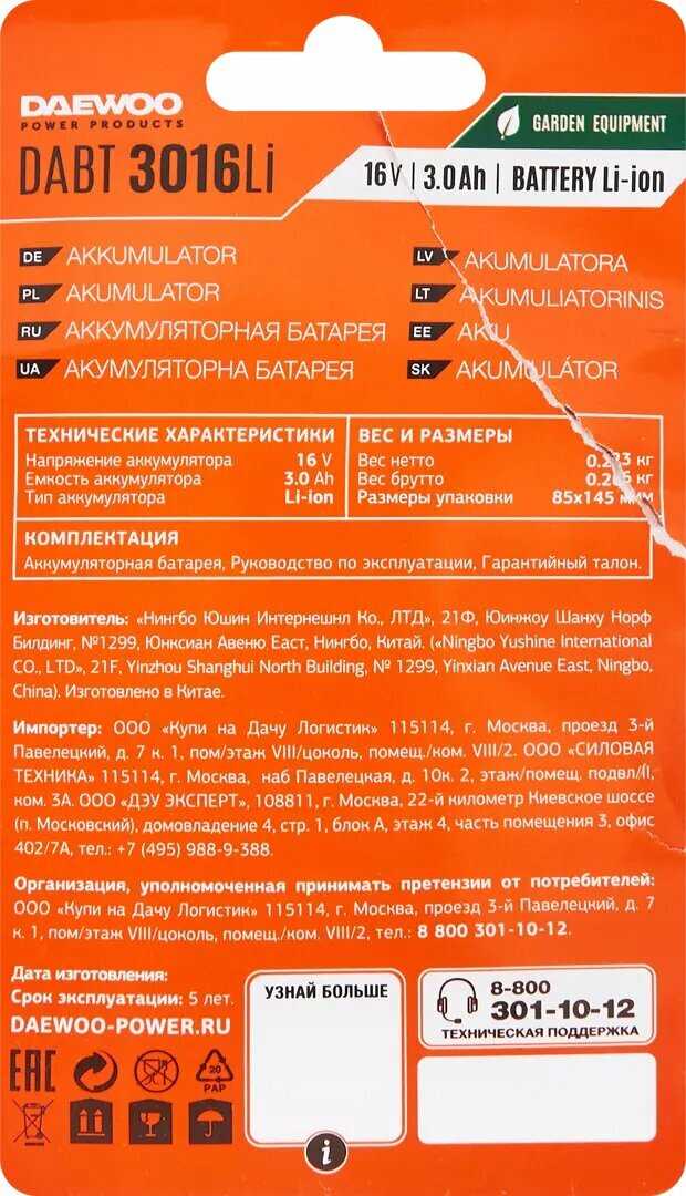 Отзывы о Аккумулятор DAEWOO DABT 3016Li (16В, 3Ач)
