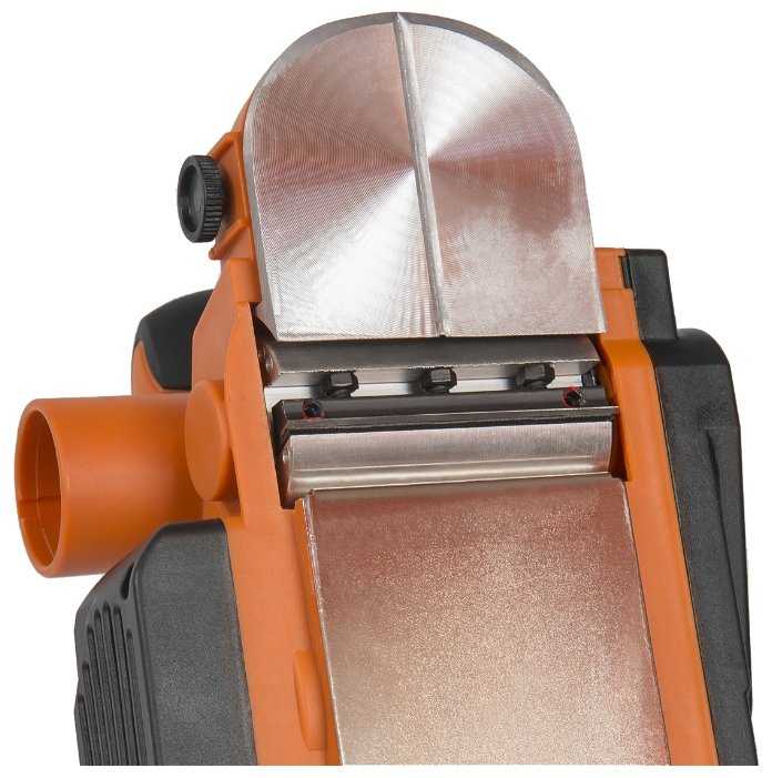 - + Два ножа на барабане двусторонние, толстая подошва, передняя часть регулируется по высоте алюминиевая. Регулировка подошвы достаточно точная и без перекосов по сторонам. Удобная рукоятка – можно работать в перчатках. Сбоку есть мешочек для сбора стружки – можно подключать пылесос.
