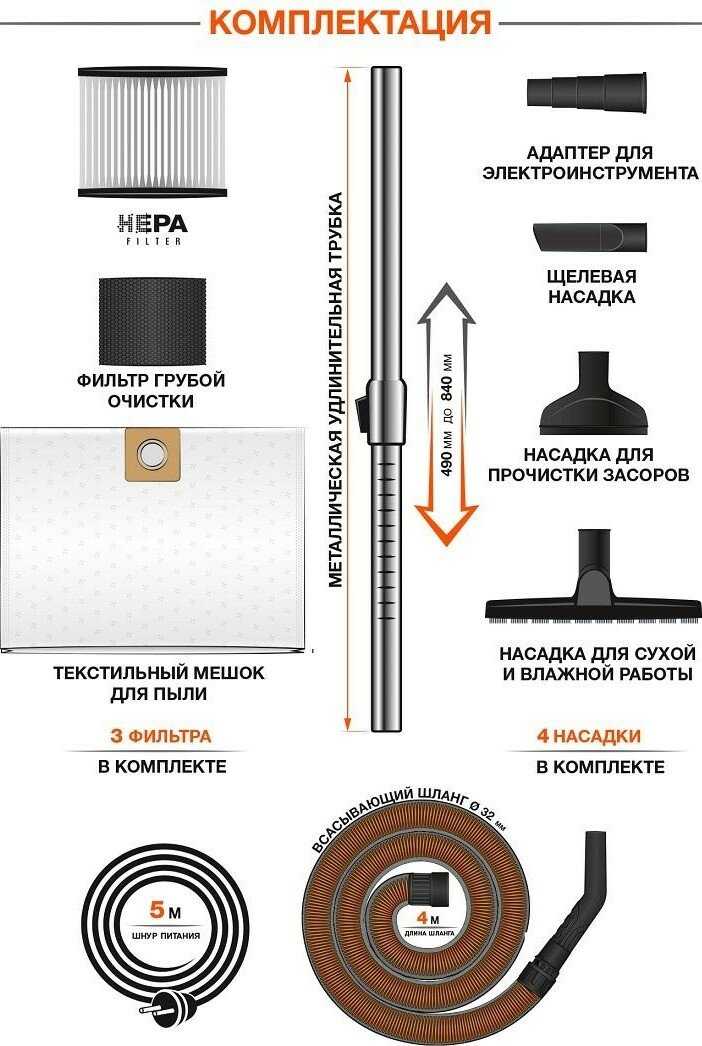 - + Качественно сделан, длинный шланг и провод. Есть насадка – переходник под инструмент. Функция самоочистки. Толковые фильтры.